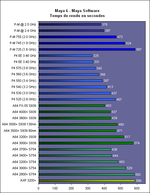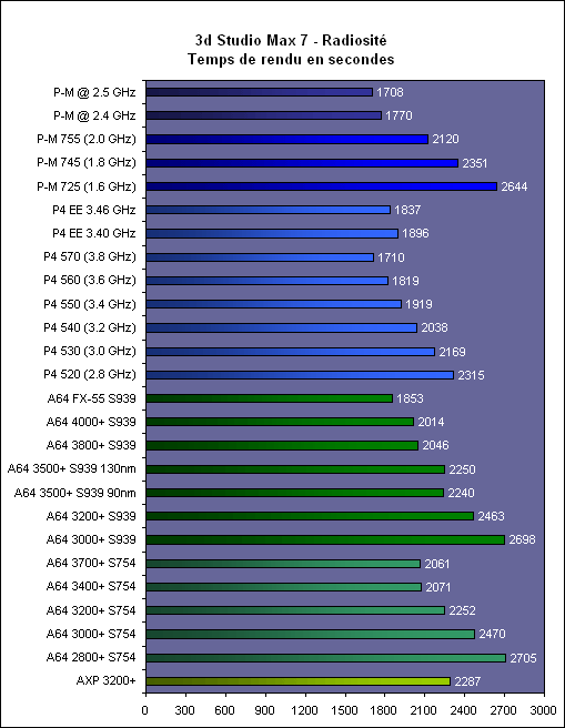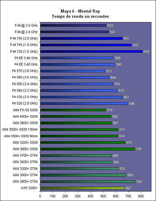 Dans notre seconde scène de test utilisant le moteur de rendu Mental Ray, le P-M à 2.0 GHz offre les mêmes performances qu’un P4 3.0 GHz, et se situe entre les A64 3500/3200+ en S939 et 3200+/3000+ en Socket 754. A 2.5 GHz, le Pentium M n’a rien à envier aux P4 570 a 3.8 GHz / Athlon FX-55.