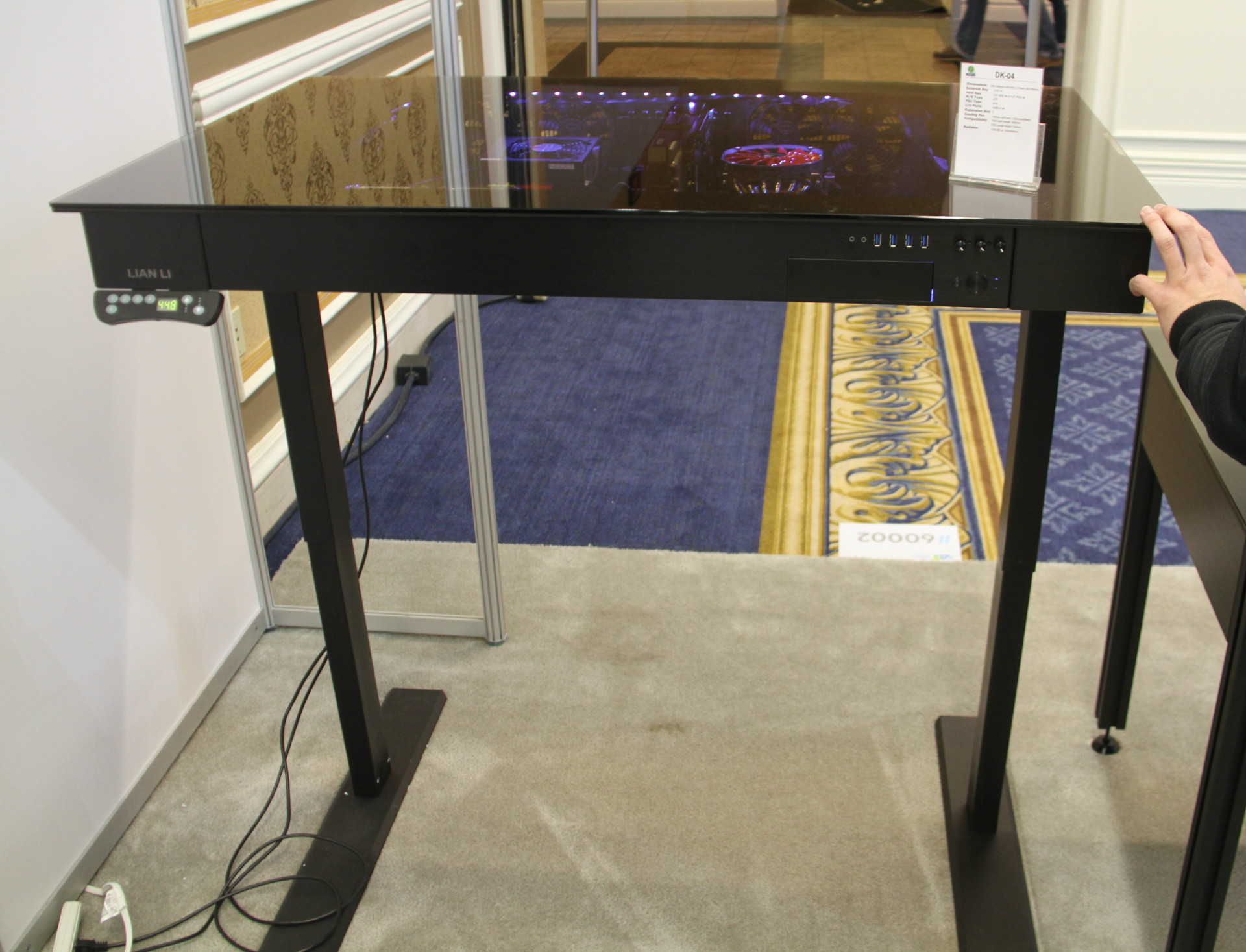 Ensuite, Lian Li présente le PC bureau DK-04 qui a la particularité d'être équipé d'un système de réglage en hauteur motorisé de +/- 70cm à +/- 120cm. De quoi pouvoir travailler assis ou debout tout en gardant son PC à l'œil.