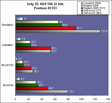Comme vous pouvez le voir, la gamme GeForce2 s´avère nettement au dessus de la concurrence, et ce dans tout les benchmarks. Le passage de GeForce2 GTS à GeForce2 Ultra apporte un gain de performance élevé sous Simulation et MCAD40, significatif sous MCAD150 et ... inexistant sous Animation.