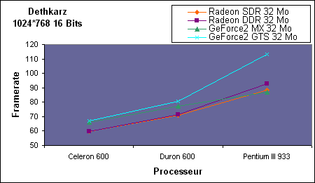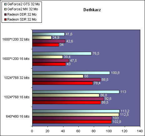 Sous Dethkarz, on retrouve un peu des résultats obtenus sous Quake III et Unreal Tournament. Jusqu´au 1600*1200 32 bits, c´est la GeForce2 GTS qui l´emporte largement, pour se faire finalement battre dans cette résolution très gourmande en bande passante mémoire par la Radeon DDR. La Radeon SDR se comporte très bien, puisqu´elle bat la GeForce2 MX dans toutes les résolutions, exception faite du 640*480 16 bits.