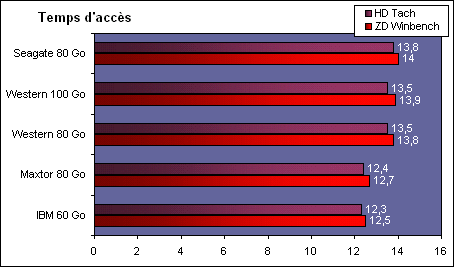 La première mesure est celle du temps d´accès, effectuée grâce à HD Tach et Winbench 99. Comme vous pouvez le voir, les disques IBM et Maxtor se détachent nettement des autres. Il faut dire que le disque Maxtor ressemble de près à un Quantum, et que les disques Quantum étaient réputés tout comme les IBM pour leur temps d´accès assez bas. On retrouve ensuite les disques Western, qui offrent dans leur version 80 et 100 Go des temps d´accès équivalents, puis le disque Seagate, qui occupe la dernière place. Il est à noter que les WD800BB et WD1000BB ont tendance, tout comme nous l´avions remarqué sur le WD200BB, a ne pas offrir un temps d´accès exceptionnel à froid. Il faut en fait attendre que le disque ait un peu "chauffé" pour obtenir les temps d´accès mesurés ici.