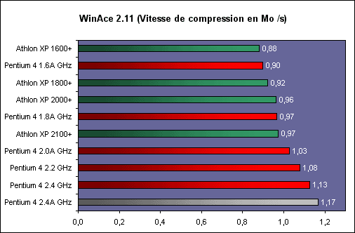 Sous WinAce 2.11 les résultats sont clairement en faveur du Pentium 4, puisque le P4 1.6A est entre XP 1600+ et 1800+, et que le P4 1.8A suffit pour arriver au niveau du XP 2100+. Les versions 2.0A, 2.2 et 2.4 GHz enfoncent un peu plus le clou. Là encore, le fait d’avoir utiliser trois logiciels de compression nous a permis de voir, tout comme lors des tests de rendu ou de compression MP3, que les résultats de la bataille Athlon XP / Pentium 4 peuvent beaucoup varier au sein même d’une même catégorie de programmes, ce qui peut entraîner des jugements en partie faussés si l’on se contente d’un seul programme. Une procédure de test n’intégrant que Lightwave et WinAce avantagerait par exemple beaucoup trop le Pentium 4, alors que ce serait le contraire pour une procédure n’intégrant que Maya et WinZip !