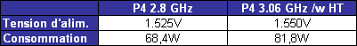 Intel annonce aujourd´hui un nouveau processeur, le Pentium 4 3.06 GHz with HyperThreading Technology, que nous appellerons P4 3.06 GHz HT pour faire simple. Plus qu´une simple augmentation de fréquence, ce processeur intègre comme son nom l´indique une nouvelle technologie. Revue de détails de ce nouveau CPU !Pentium 4 C-1 3.06 GHzEn dehors de l´HyperThreading, rien de bien nouveau sur ce P4 3.06 GHz. Comme son prédécesseur à 2.8 GHz, il utilise le dernier core pour Pentium 4 C-1. Toutefois, alors que ce dernier était alimenté en 1.525V par défaut, le P4 3.06 GHz requiert une tension de 1.550V. Combinée à l´augmentation en fréquence et à l´activation de l´HyperThreading, on arrive à une consommation en hausse de 19.5% comme vous pouvez le voir sur le tableau ci-dessous.