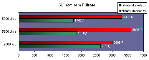 Voici un test de Fillrate sous GL_ext_rem. Du fait de ces 8 pixel pipelines complets, la Radeon 9800 Pro s'en tire mieux lorsqu'il s'agit de simple texturing (une texture par pixel), mais ce sont les cartes NVIDIA qui prennent les devants lorsqu'il s'agit de multi-texturing. La 5800 Ultra est devant la 5900 Ultra du fait de la fréquence du GPU supérieure.