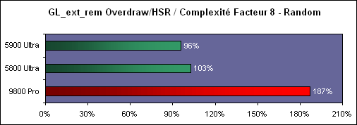 Le gain observé via le HSR (Hiddent Surface Removal) lorsqu'on effectue le rendu d'une scène dotée d'un overdraw de 8 (en moyenne 7 pixels cachés pour 1 visible) sous GL_ext_rem est assez proche entre 5900 & 5800, preuve que NVIDIA n'a rien changé de ce côté. La solution ATI est bien plus performante dans ce domaine.