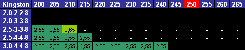 Grosse déception pour le modèle Kingston. En effet, nous n´avons pas pu atteindre les spécifications de manière complètement stable (pas d´erreurs sous memtest), et les barrettes ont montrés leurs limites à 240 MHz ! Bref, pour des modèles étiquetés "evaluation", c´est plus que dommageable. Le choix de puces Samsung n´est certainement pas étranger à ce problème, puisque Corsair par exemple les utilise mais pour des barrettes de ... PC3700.