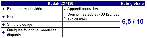 Mais surtout, et c’est là que le CX7430 sort du lot, cet appareil produit des vidéos de très bonne qualité. Les images sont fluides, les contours des objets sont nets, la mise au point est correcte et les couleurs sont agréables. Cette fois, c’est sur, vous reconnaîtrez les sujets capturés. On est bien loin des premières vidéos muettes en 320 x 240 (le Fuji A340 est l’un des derniers modèles du genre). Seul regret : un bruit de fond perturbe la restitution sonore, sinon assez agréable. En plus de cela, ce mode n’est même pas gourmand. Notre vidéo test de 15 secondes tient sur 2,6 Mo. Prévoyez tout de même l’achat d’une carte 128 Mo minimum pour profiter à plein de cette très bonne fonction.