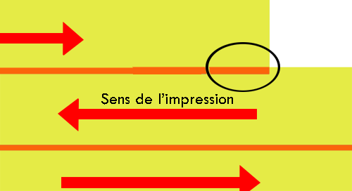 Dernière hypothèse : c´est un double problème de précision du chariot d´entraînement et de mélange d´encres dans le papier. Les bandes visibles sont toutes horizontales par rapport au sens du papier quand il sort. Elles apparaissent à chaque retour de chariot. A chaque fois, chaque nouvelle bande d´encre vient recouvrir en partie la précédente.