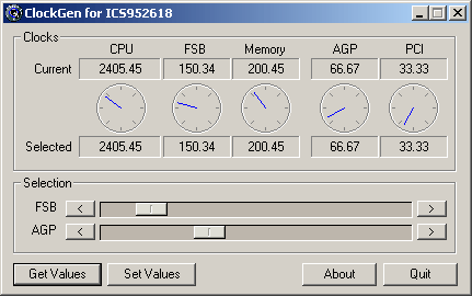 En pratique, nous avons pu atteindre les 2.5 GHz sur notre Pentium M 755 à 2.0 GHz. Pour ce faire, nous avons utilisé un FID de 17x, un FSB de 147 MHz et un ratio mémoire de 4:3 soit de la DDR à 196 MHz. Nous avons également pu tester rapidement l’overclocking sur un Pentium M 745 (1.8 GHz), qui a pu atteindre 2.4 GHz en 16x150 avec la mémoire à 200 MHz (DDR400 donc).
