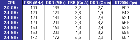 A titre d’information voici quelques chiffres de performances atteints en overclocking avec différentes combinaisons de fréquence fsb/mémoire, le tout sous Unreal Tournament 2004 qui est comme beaucoup de jeux assez dépendant, en sus de la fréquence processeur, de ces paramètres :