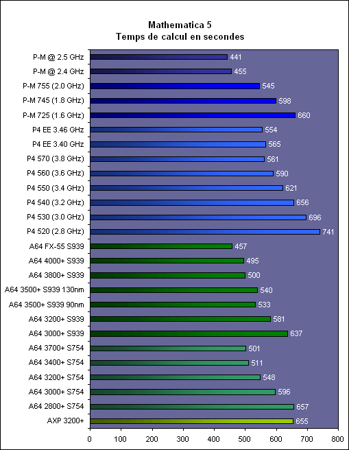 La vitesse du Pentium M est ici excellente puisqu’il se permet à 2 GHz d’être devant les P4 les plus véloces. Les A64 se comportent mieux, avec des niveaux de performances comparables aux 3500+ S939 et 3200+ S754. Après overclocking, le Pentium M se situe au niveau de l’Athlon 64 FX-55, et est même plus rapide à 2.5 GHz.