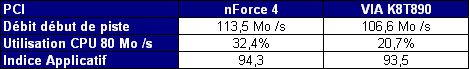 Comme vous pouvez le constater, en terme de performances brutes, à savoir le débit, et de performances pratiques, à savoir notre indice de performance, la carte Adaptec semble un peu moins apprécier le bus PCI du K8T890 avec un écart qui reste toutefois faible. Par contre, on notera le taux d’utilisation processeur bien plus important sur le nForce 4, alors que l’on demande exactement la même chose. Le K8T890 semble donc bien moins gourmand que le nForce 4 lors de l’utilisation de son contrôleur de bus PCI.