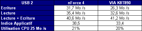 Les débits sont ici à l’avantage du nForce 4 puisqu’il est 8.6% plus rapide en lecture et 20.5% plus rapide en écriture. L’indice applicatif s’en ressent avec un avantage de 15% pour le contrôleur du nForce. On notera par contre que lorsqu’on fait une copie d’un disque USB 2.0 à l’autre, les performances sont assez proche avec une bande passante cumulée de 40 Mo /s environ. On reste tout de même assez loin des 60 Mo /s promis en théorie par la norme USB 2.0.