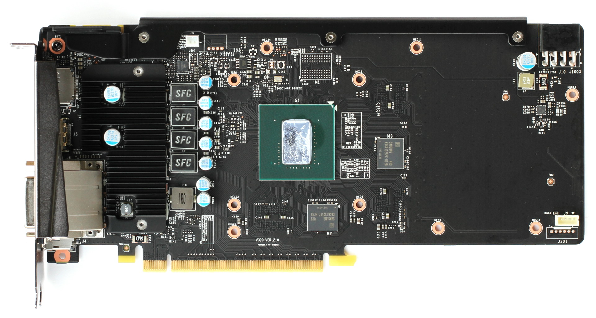 Le long PCB présente une grosse zone d'espace vide et il semble évident que sa taille est uniquement liée à celle du ventirad. Il exploite 4 phases pour alimenter le GPU et une de plus pour le mémoire GDDR5 Samsung.