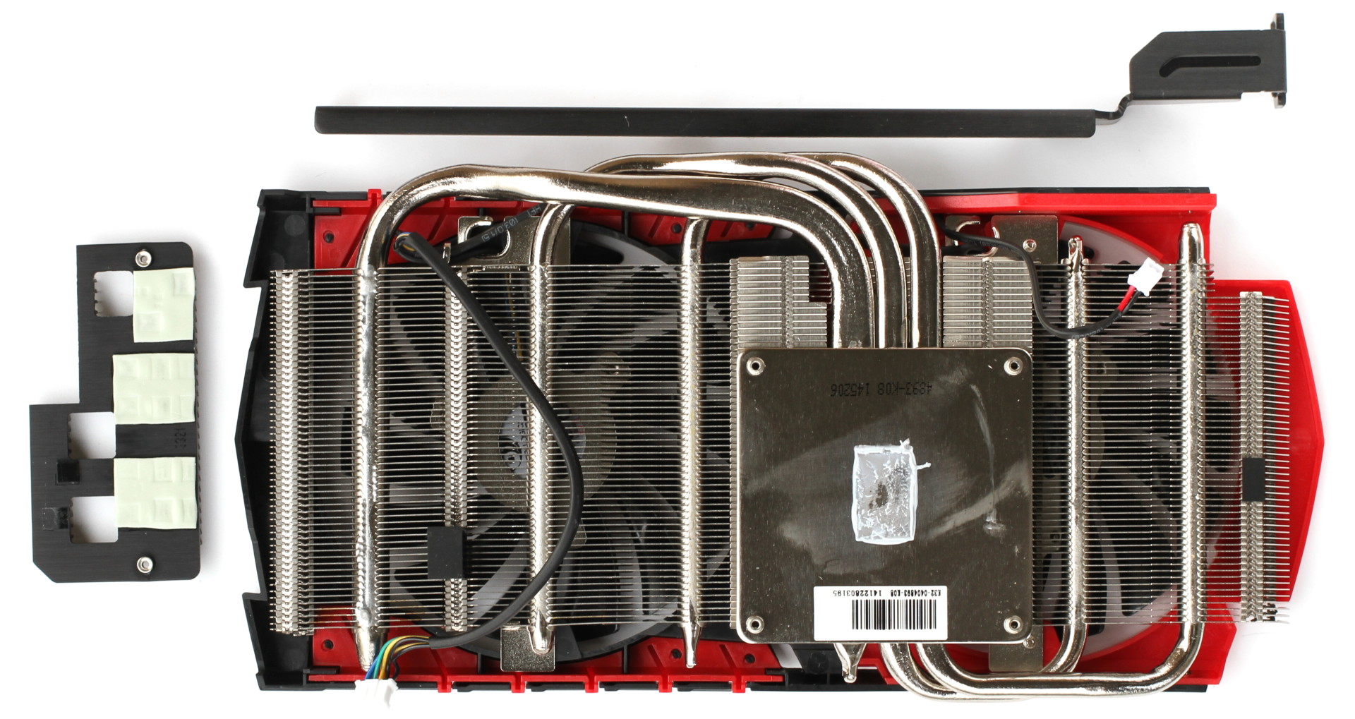 Nous retrouvons 3 caloducs (contre 4 pour la GTX 970 Gaming) pris en sandwich entre une base en aluminium et un large radiateur. Deux de ces caloducs sont de type 6mm et plutôt long, de manière à parcourir le radiateur de part et d'autre du GPU, alors que le troisième est de type 8mm et va rejoindre l'extrémité du radiateur.