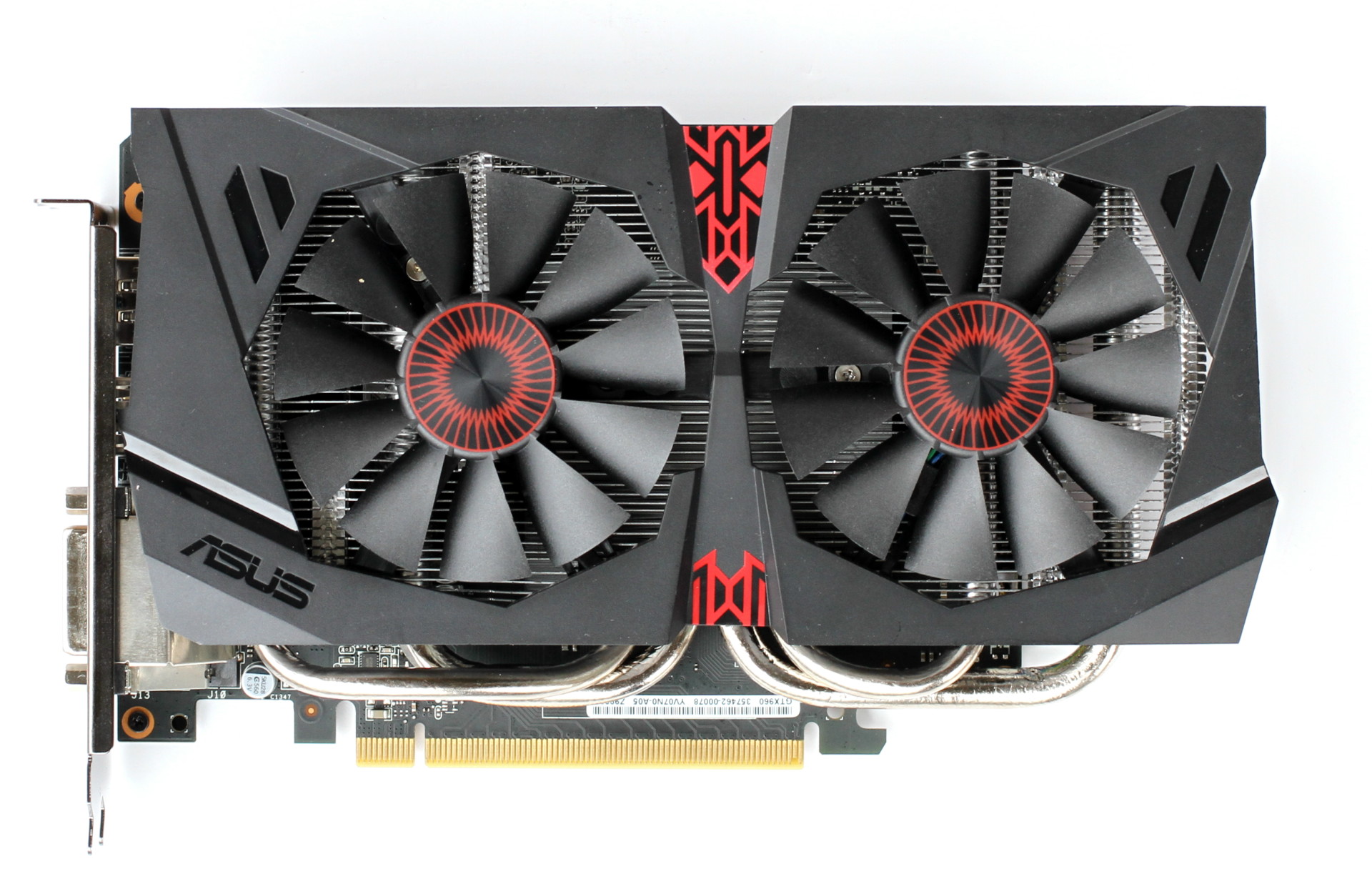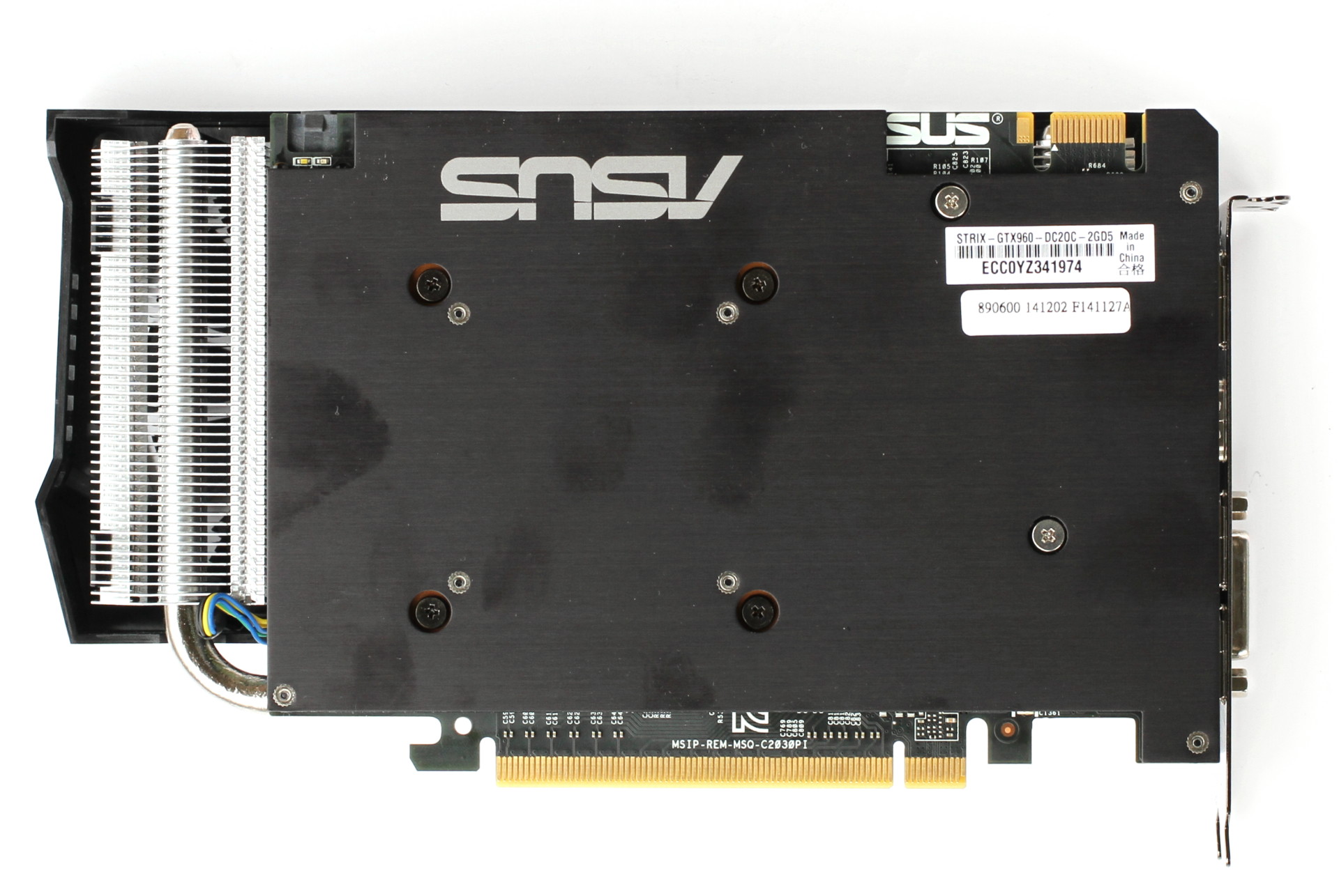 La GTX 960 Strix est plutôt compacte avec 21.5cm de long, dont une partie est par ailleurs uniquement liée au ventirad qui dépasse à l'arrière du PCB de 17cm. A noter que la carte est par contre 1 cm plus haute que la normale.