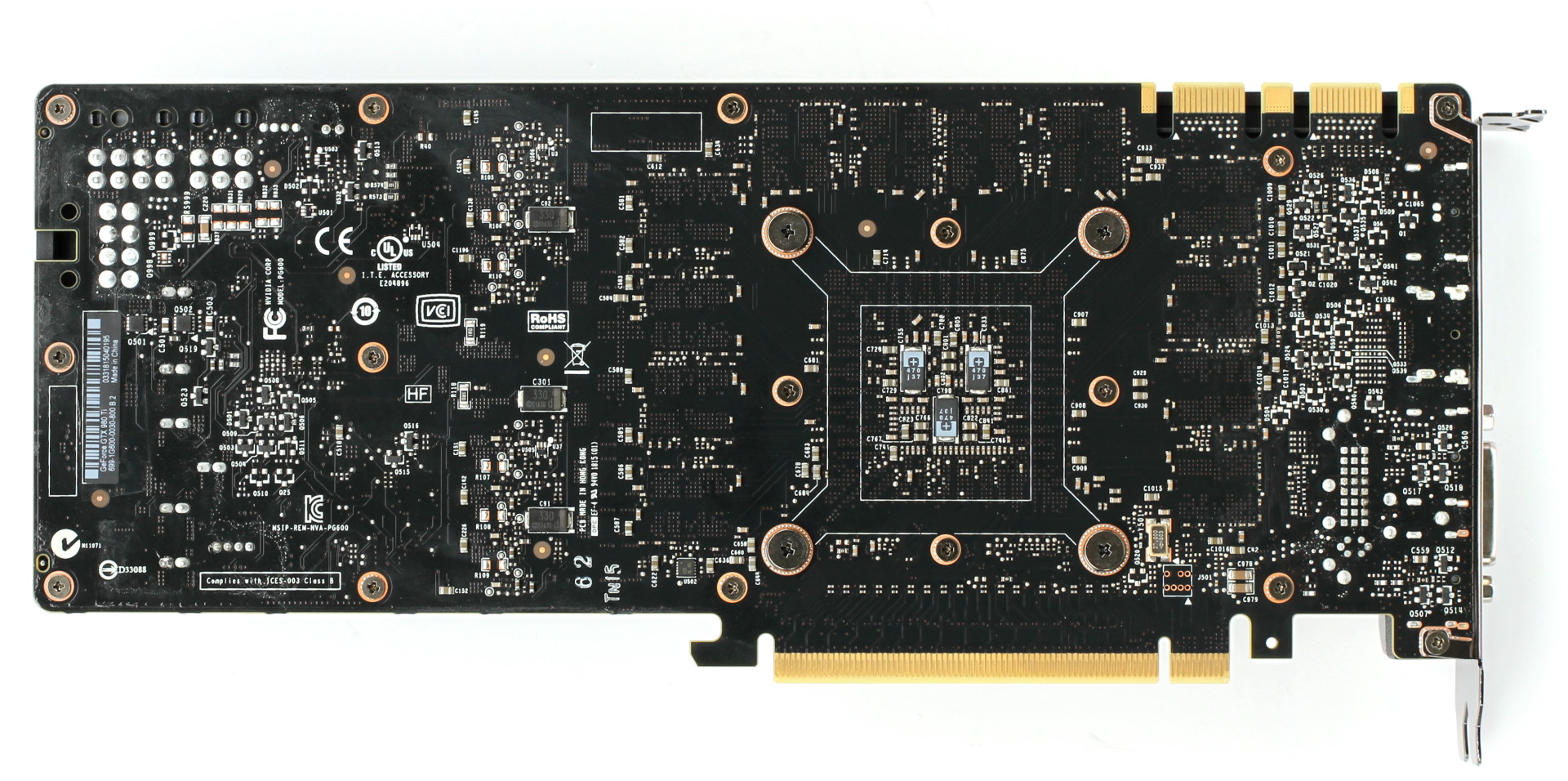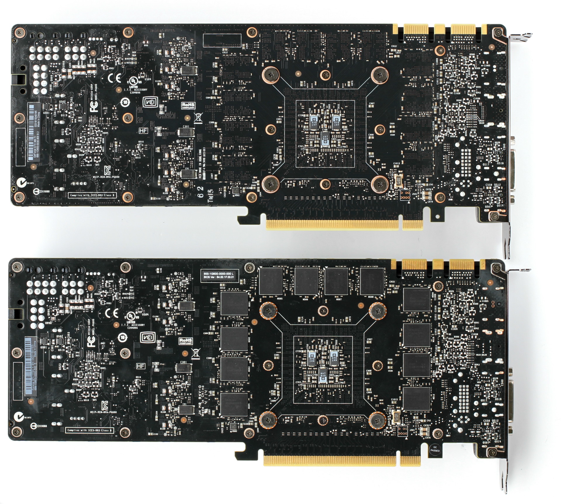 La différence la plus notable par rapport à la GTX Titan X est bien entendu l'absence de puces mémoire à l'arrière du PCB. Pour intégrer 12 Go de GDDR5 sur celle-ci, Nvidia a eu recours à 24 puces Hynix 4 Gb (512 Mo) en mode clamshell (une paire de puces par canal 32-bit), soit 12 par face. Très logiquement, la GTX 980 Ti se contente des 12 puces de la face avant.