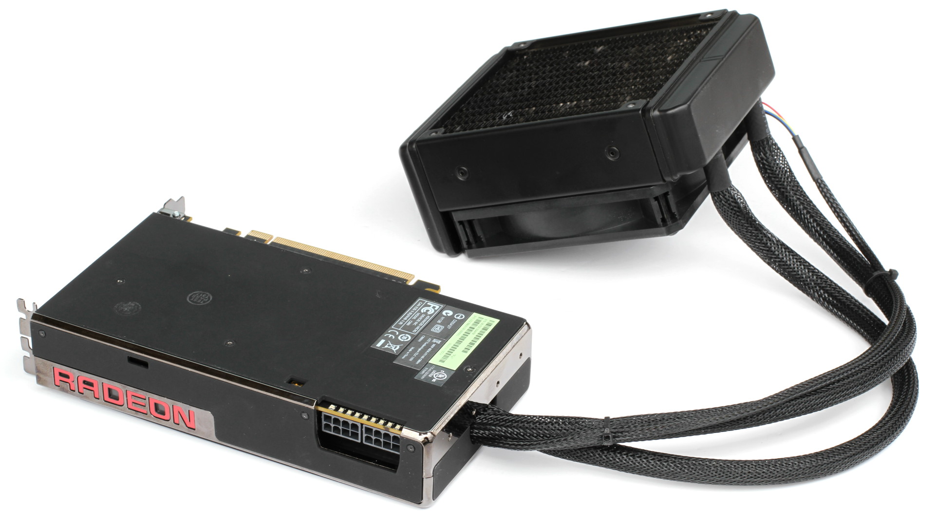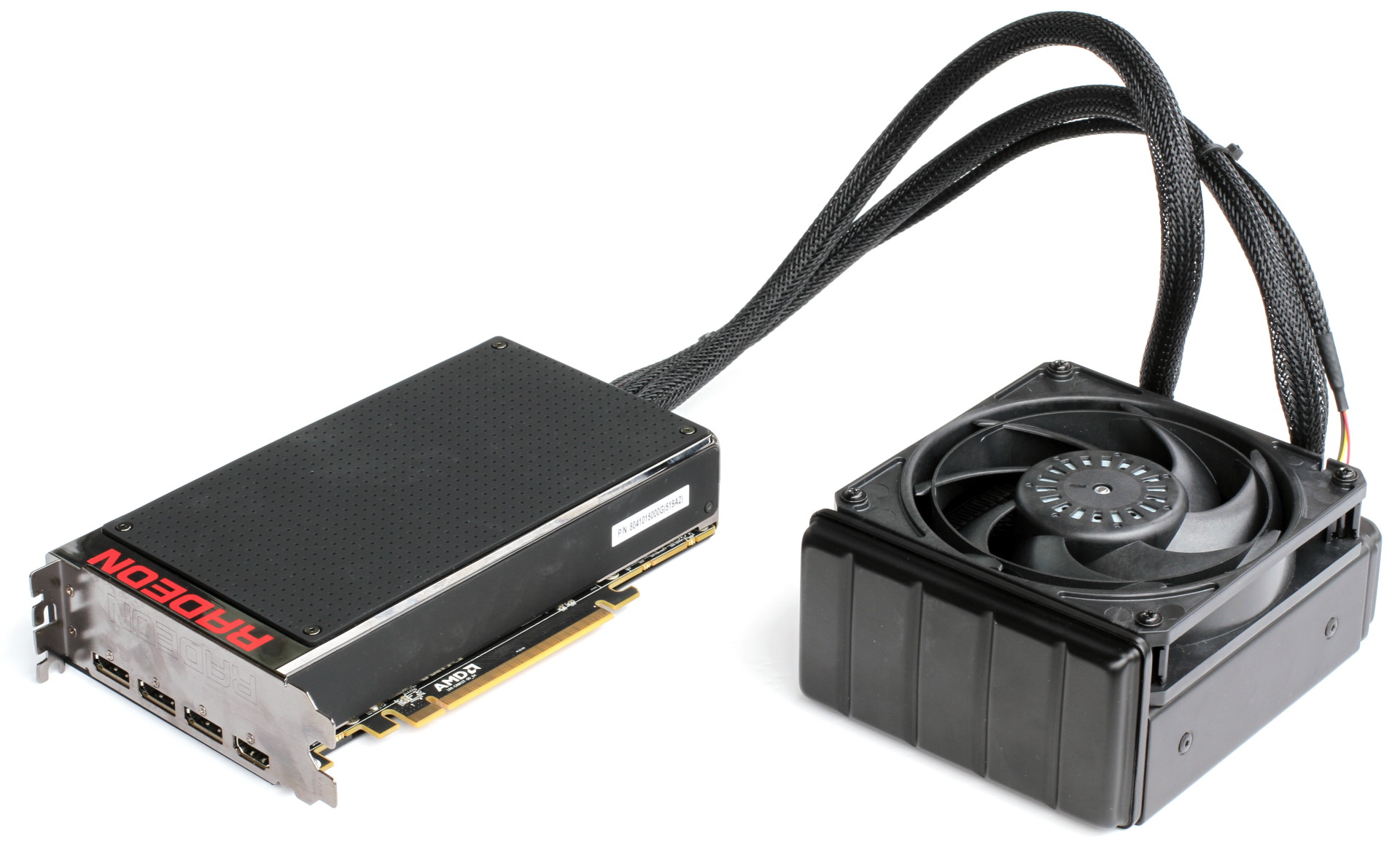 L'avantage de cette solution est d'autoriser un design compact pour la carte graphique (un peu moins de 20cm) et de profiter donc pleinement du gain lié à la HBM de ce côté. Ce à quoi il faut bien entendu ajouter l'espace occupé par le radiateur et son ventilateur (155x120x65mm), les tuyaux ayant une longueur de 40cm.