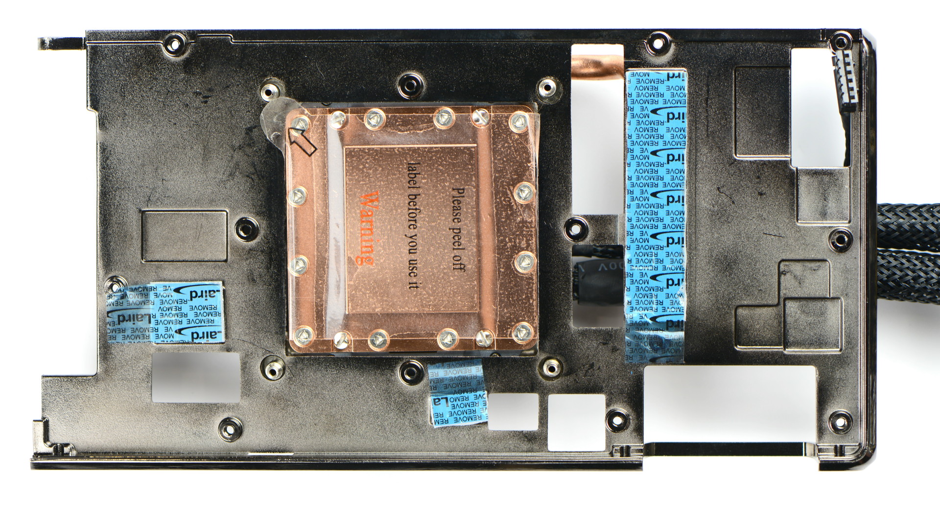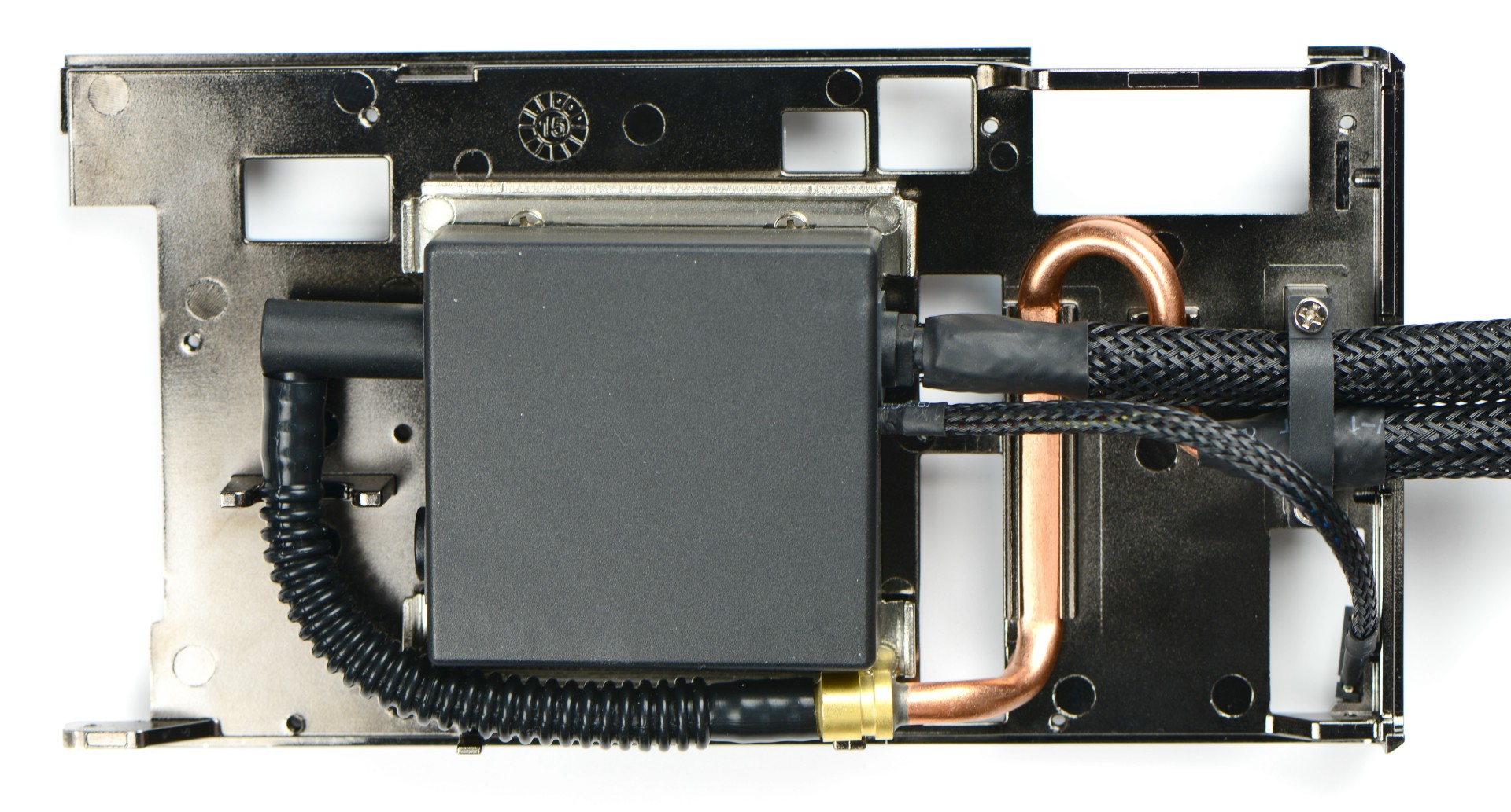 Sous le capot, nous pouvons observer le bloc de refroidissement signé Cooler Master. Entre la pompe et l'un des tuyaux du circuit de watercooling, un conduit en cuivre est collé contre la structure du système de refroidissement de manière à s'occuper du dégagement calorifique de l'étage d'alimentation.