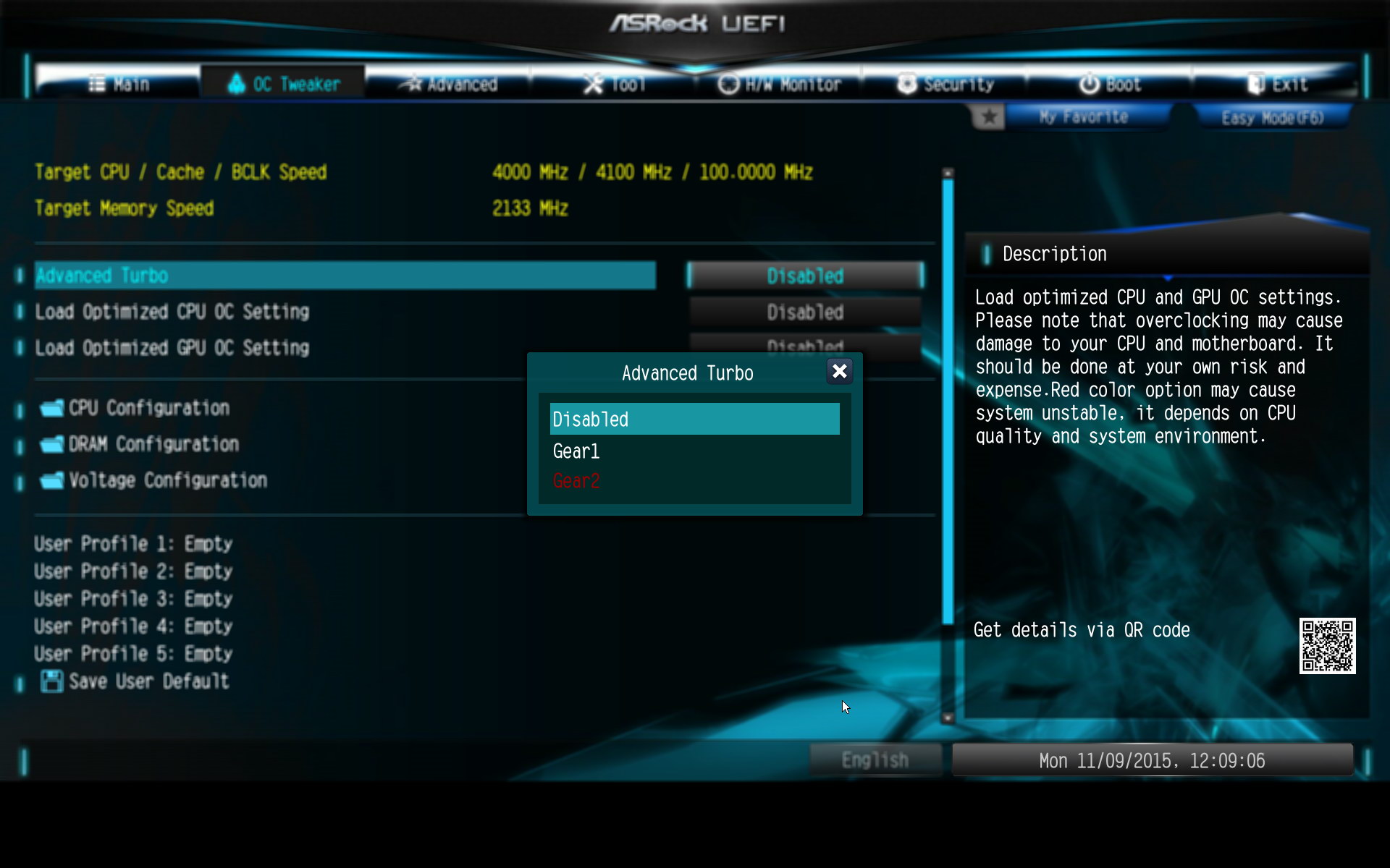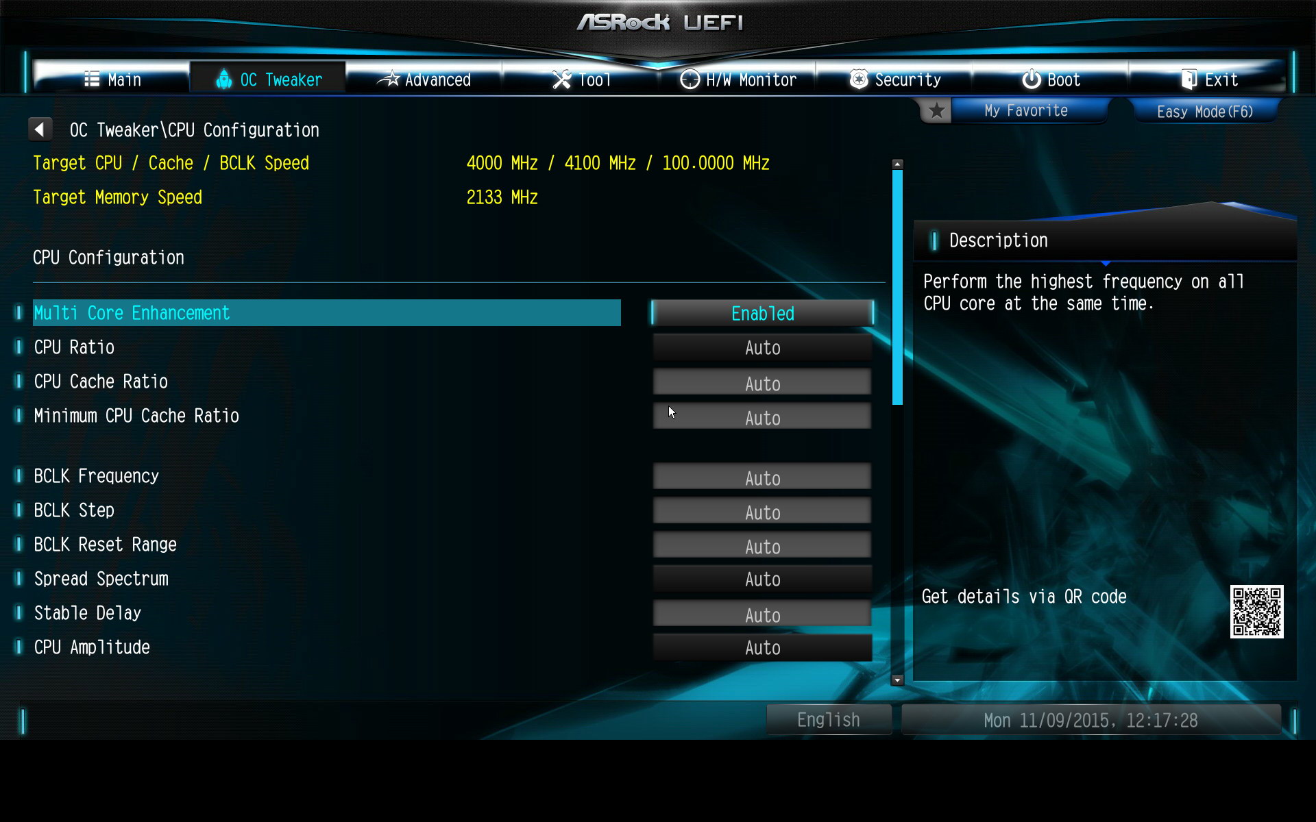 Côté overclocking on a droit à une organisation "à la Gigabyte" à savoir avec des réglages CPU, RAM et tensions séparés dans trois sous menus. Asrock ajoute des options pour overclocker automatiquement le CPU et l'IGP avec une série de préréglages plus ou moins agressifs. Ce que l'on apprécie beaucoup moins, c'est que "l'optimisation multicoeurs" (fixer tous les ratios a 42x) est ici activée par défaut, là ou chez les autres elle s'active avec l'XMP en général.