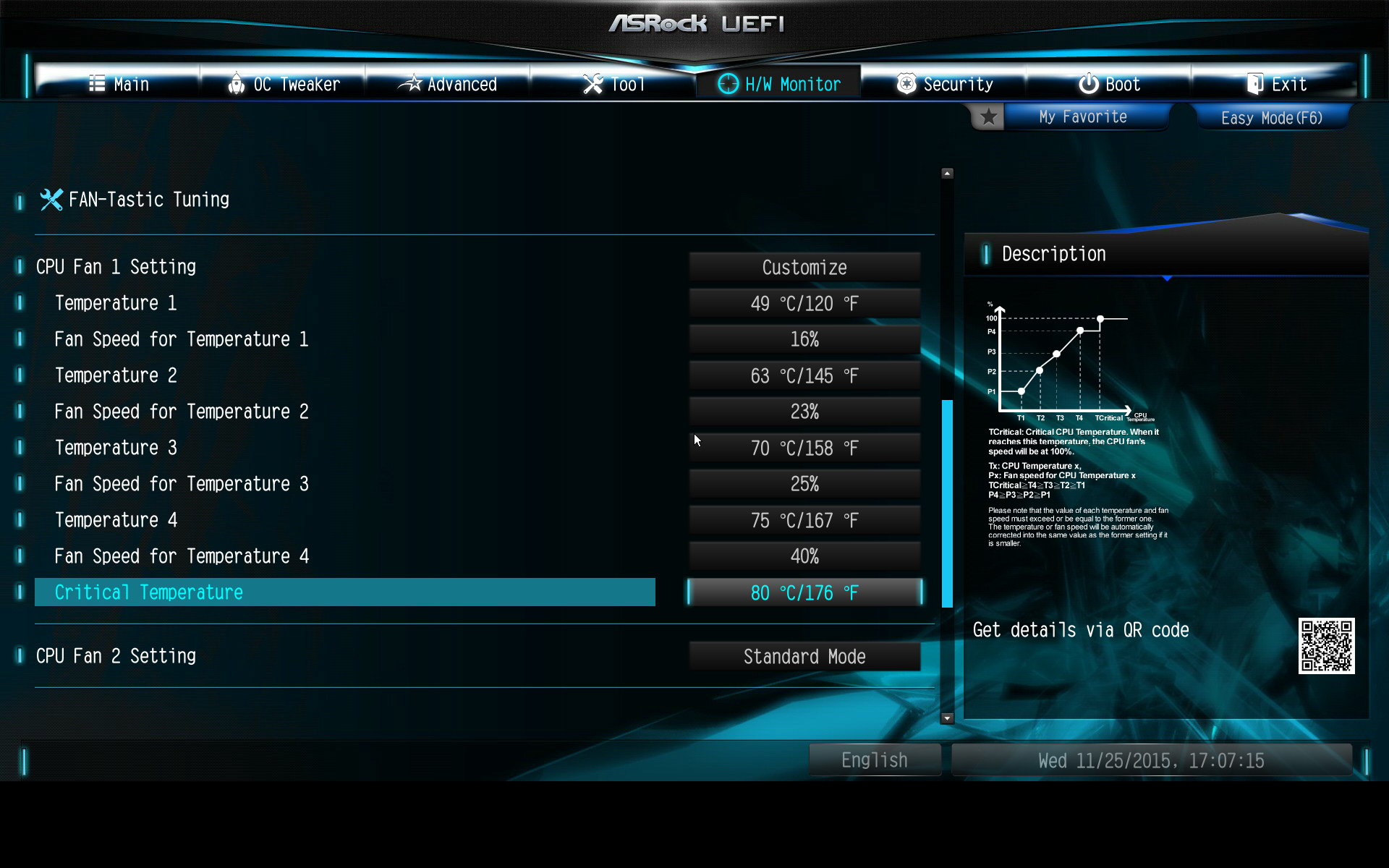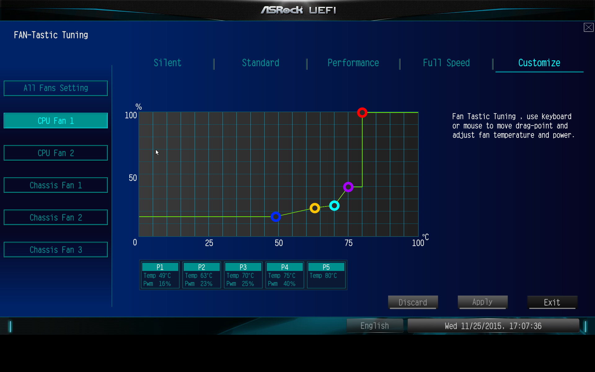 Les pages de monitoring regroupent les informations classiques et un peu plus bas on pourra modifier manuellement les réglages des ventilateurs. Les réglages CPU sont indépendants et on notera que pour le châssis, on a là aussi la possibilité de choisir de réguler en fonction de la température système ou CPU. On peut également accéder au réglage graphique, baptisé FAN-Tastic tuning. Ici le réglage se fait à la souris mais contrairement à la concurrence, les changement ne se font pas en temps réel, ce qui est un peu dommage (ils ne sont appliqués qu'après un reboot).