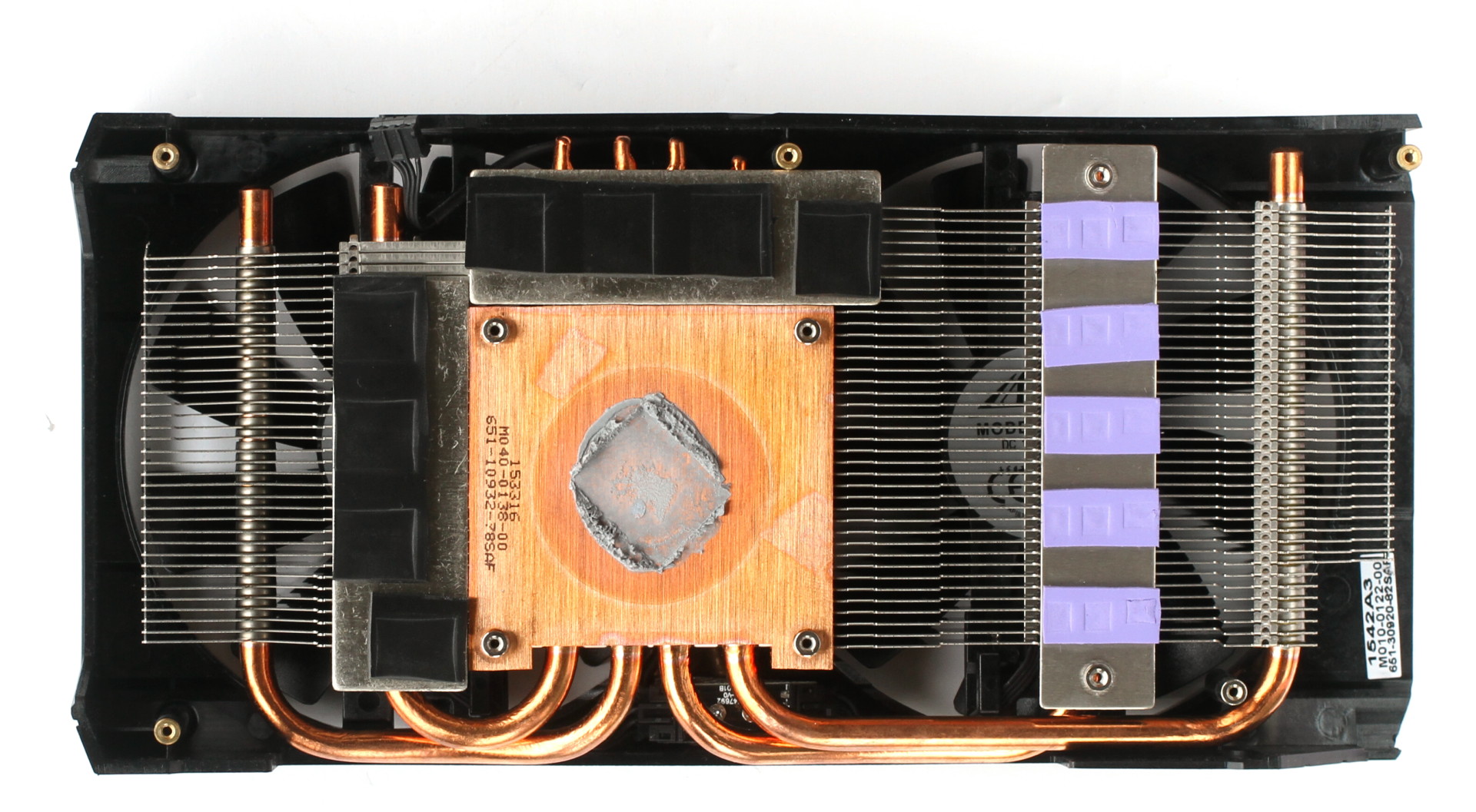 Pour assurer le refroidissement, Sapphire a opté pour 4 petits caloducs de 6mm de diamètre qui sont pris en sandwichs entre une base en cuivre et le radiateur en aluminium. Les ailettes de celui-ci sont positionnées horizontalement avec relativement peu de zones d'échappement en dehors des extrémités de la carte ce qui signifie qu'une partie de l'air chaud sera redirigé vers les baies à disques durs.