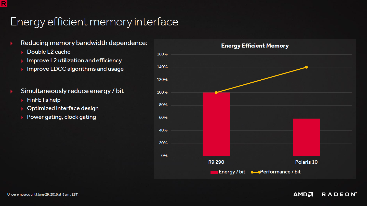 Pour accompagner un bus mémoire qui reste à 256-bit, comme Tonga, mais qui est divisé par 2 par rapport aux 512-bit de Hawaii et à la Radeon R9 290 à laquelle AMD aime comparer la Radeon RX 480, il était important pour AMD de pouvoir tirer plus de bande passante effective par bit. Pour cela, en plus des interfaces mémoire retravaillées pour monter plus haut en fréquence (support de la GDDR5 jusque 8 Gbps) et du cache L2 quadruplé par contrôleur 64-bit, les techniques de compression du framebuffer ont été améliorées.