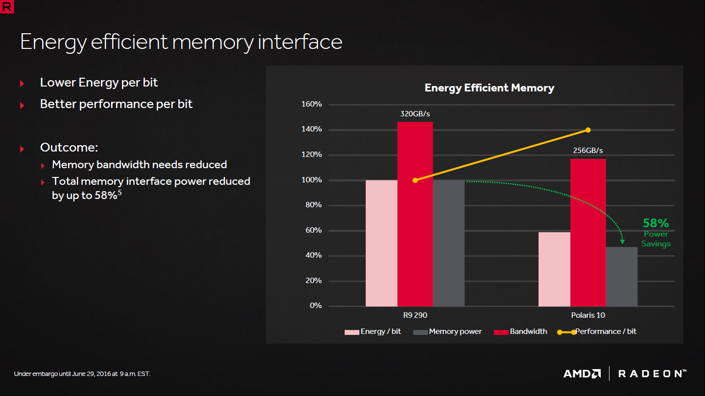 Toujours selon les chiffres communiqués par AMD, l'interface mémoire de Polaris 10 ne consommerait que 42% de l'énergie nécessaire à celle de Hawaii, ce qui est également lié au passage au 14nm FinFET. A largeur de bus identique, la consommation est ainsi légèrement inférieure pour Polaris alors que la GDDR5 exploitée monte fortement en fréquence. Attention, AMD n'a probablement pas choisi la comparaison avec la R9 290X par hasard, celle-ci utilisant de la mémoire faiblement cadencée (5 Gbps) au vu de sa tension de 1.5V. En pratique il existe de la GDDR5 jusqu'à 6 Gbps à 1.35V alors que la RX 480 8 Go utilise de la GDDR5 8 Gbps à 1.5V.