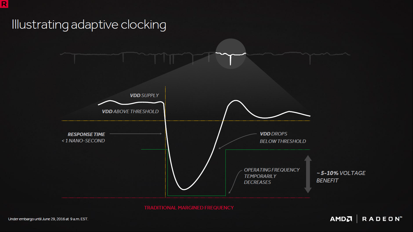 L'adaptative clocking tout d'abord est une technique qui permet de gérer les petites baisses de tension sans devoir prendre en compte de marge de sécurité importante. Comme vous le savez, les étages d'alimentation délivrent rarement une tension stable, ce qui est rendu difficile par l'intensité élevée délivrée aux GPU. Cette tension varie constamment avec de petites baisses qui peuvent atteindre 10 à 15% selon AMD. Grâce à des capteurs de tension internes, le GPU peut réduire brièvement sa fréquence avec un délai d'une nanoseconde dès qu'il détecte une petite baisse de la tension. De quoi pouvoir réduire la marge de sécurité et la tension de 5 à 10% avec une économie d'énergie conséquente à la clé.