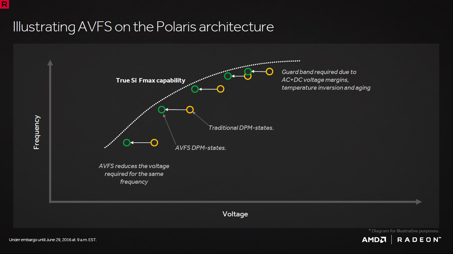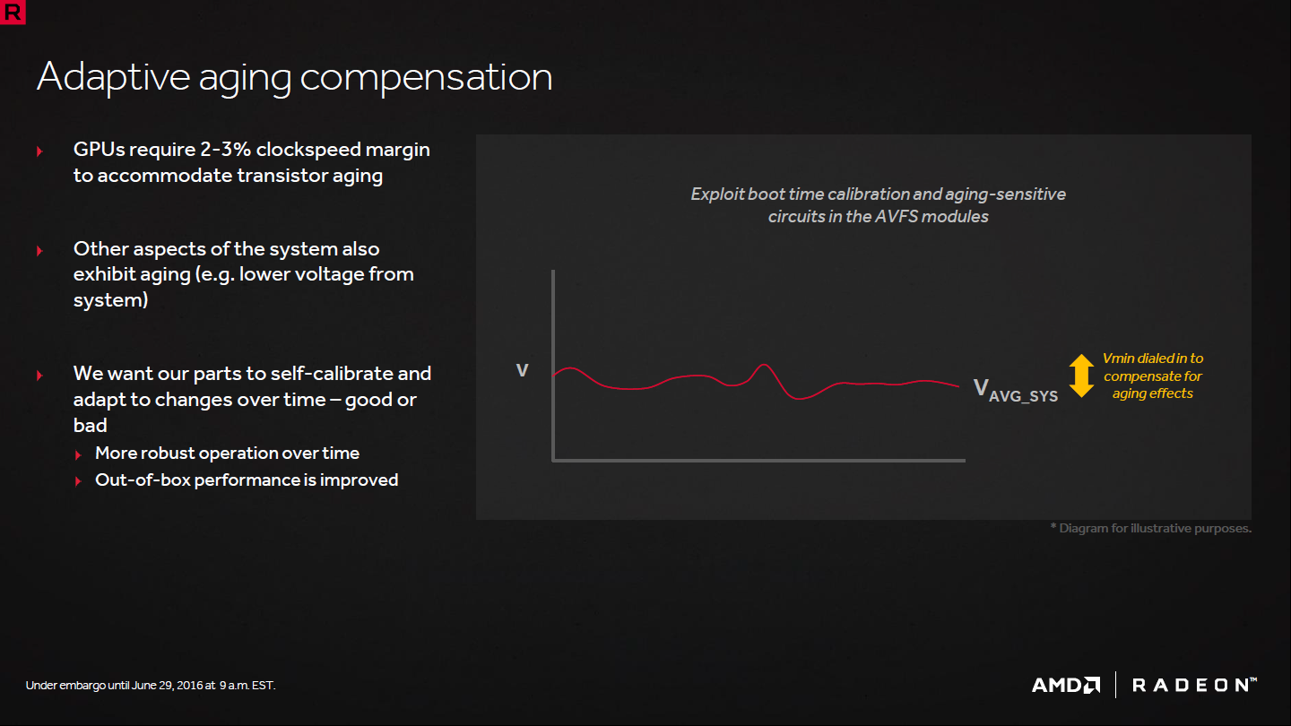 AMD nous a d'ailleurs indiqué que tous les leviers n'ont pas été activés sur la RX 480, sans préciser si c'est par choix stratégique ou par manque de temps. Par exemple, le boot time power supply calibration et l'anti aging compensation ne sont pas actifs sur cette carte graphique. Ils pourraient par contre l'être sur d'autres ou sur des déclinaisons mobiles.