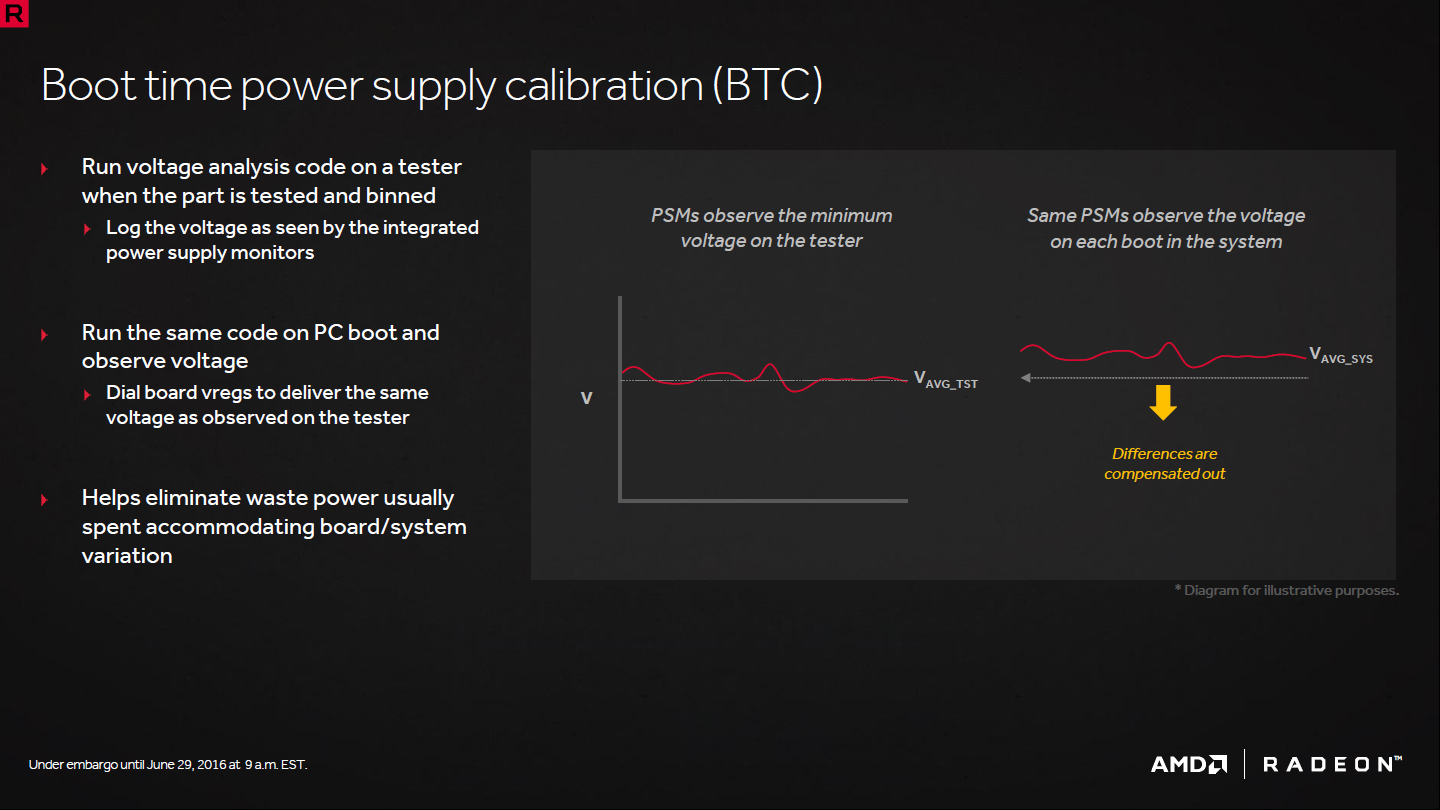 Le boot time power supply calibration (BTC) est également une technique d'auto-calibration mais cette fois plutôt de la carte dans son ensemble que de la puce. Lorsqu'un GPU demande une tension particulière au contrôleur de son étage d'alimentation, il reçoit rarement exactement la valeur demandée. Pour éviter de prendre une marge de sécurité trop importante à ce niveau, à chaque boot, le GPU va vérifier la tension exacte sur quelques points de repère et compenser la différence. Là aussi il s'agit de se rapprocher de la tension minimale de fonctionnement en fournissant une information de plus à l'AVFS.