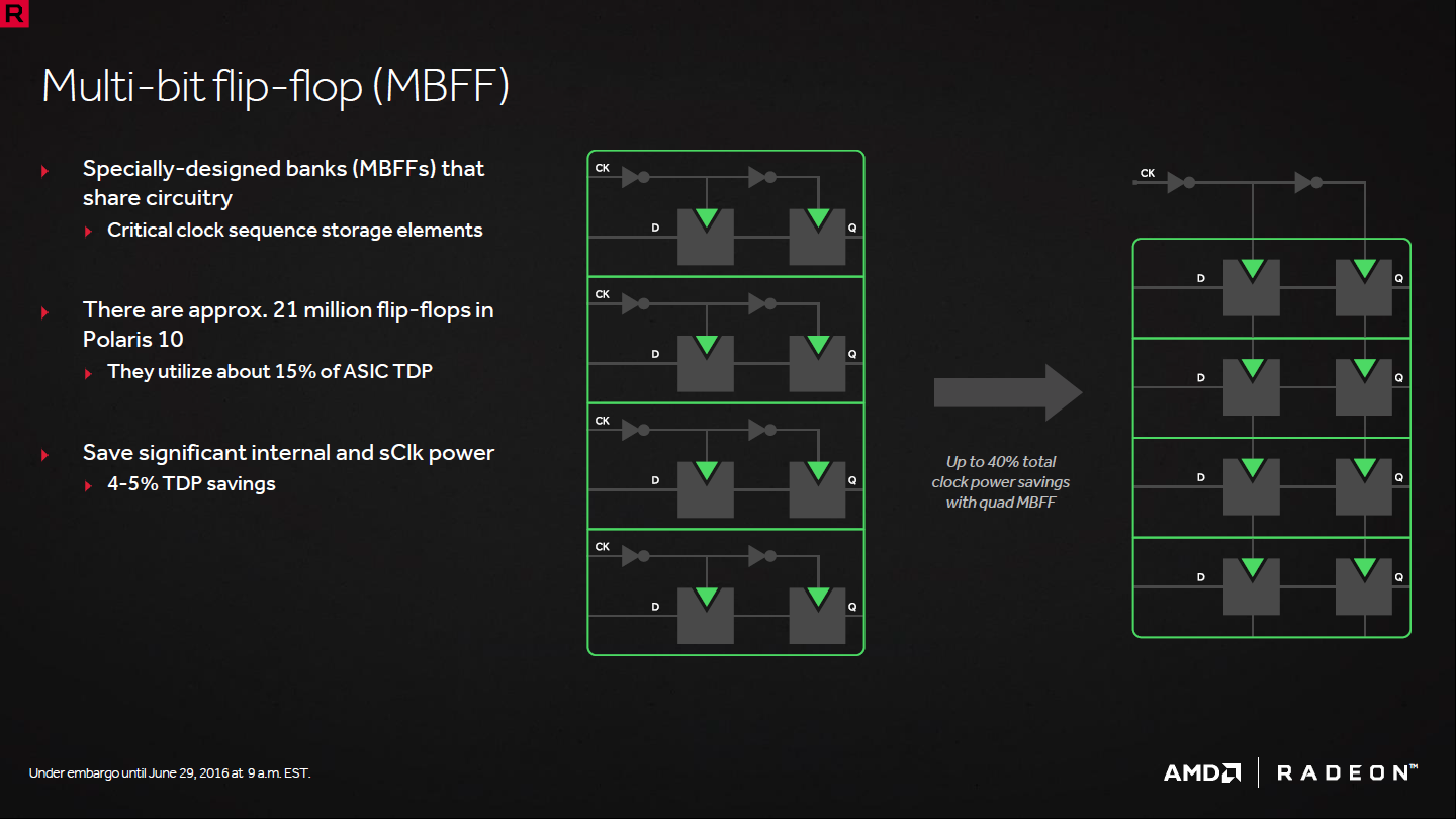 Enfin, le multi-bit flip-flop est une implémentation plus efficaces des flip-flops, ou bascules en français, qui sont de petits circuits utilisés pour mémoriser un état le temps d'un cycle d'horloge. Ils sont présents en masse, AMD parle de 21 millions de bascules pour Polaris 10 qui représentent 15% de la consommation du GPU. Polaris exploite des structures plus complexes qui combinent plusieurs bascules avec une seule source de distribution du signal d'horloge pour un gain qui peut atteindre 4 à 5% au niveau de la consommation du GPU.