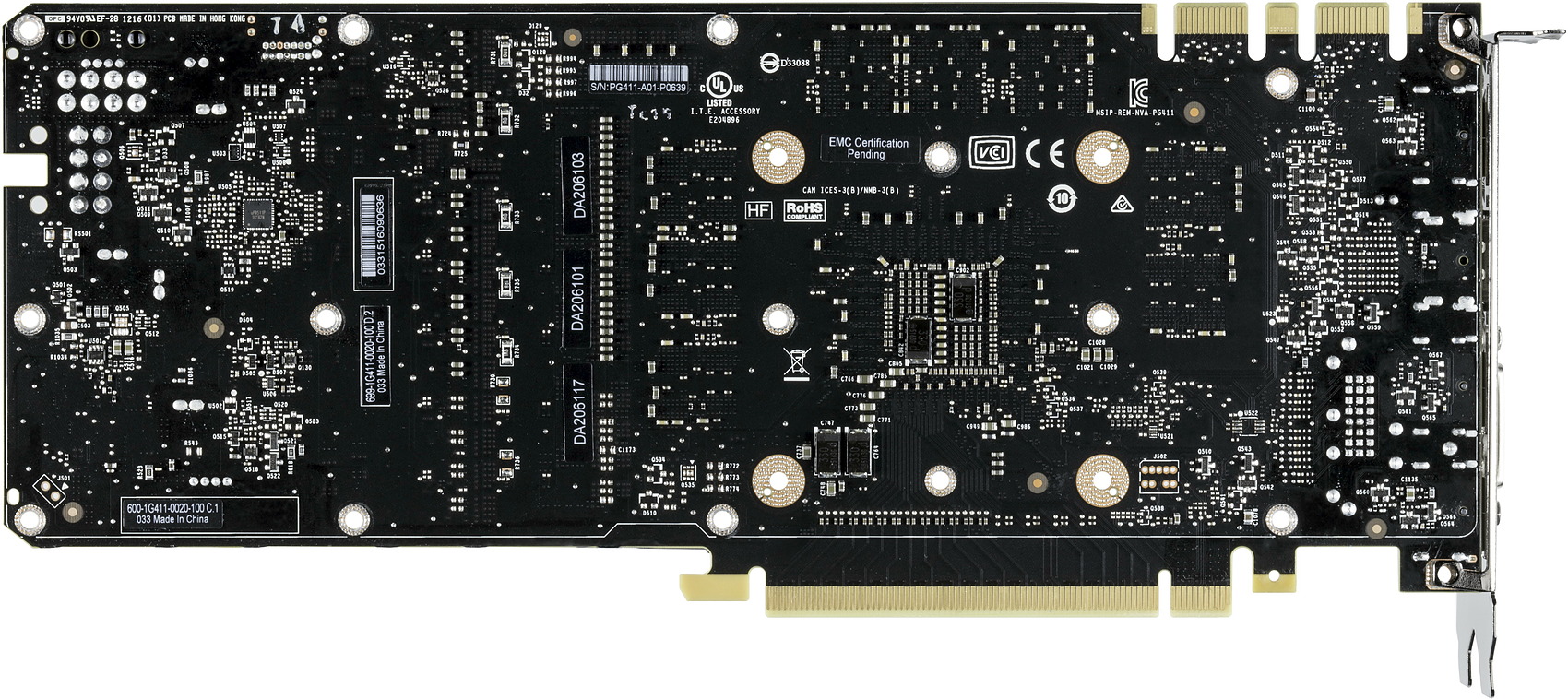 Enfin, la connectique vidéo est similaire à celle des GeForce GTX 900 : une DVI Dual Link, une HDMI et 3 DisplayPort, dont 4 peuvent être utilisées simultanément. Il y a cependant une petite différence visible pour les plus attentifs : il s'agit d'une sortie DVI-D et non plus DVI-I. En d'autres termes, la GTX 1070 ne supporte pas la connectique VGA.