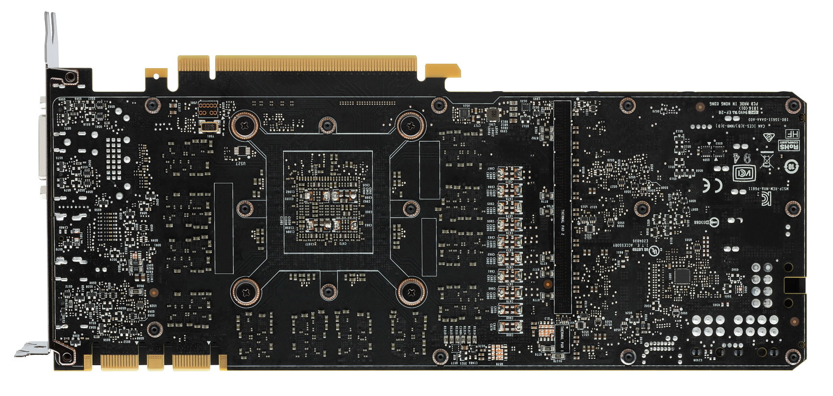 Le PCB est prévu pour accueillir jusqu'à 7 phases pour le GPU et elles sont toutes exploitées. Deux de plus sont dédiées à la mémoire GDDR5X 10 Gbps de Micron. Ces étages d'alimentations sont approvisionnés via 3 sources de 12V : un connecteur 8 broches, un connecteur 6 broches et le bus PCI Express. Un espace a été prévu pour recevoir des composants supplémentaires mais nous n'avons aucune information concernant ce dont il s'agit.