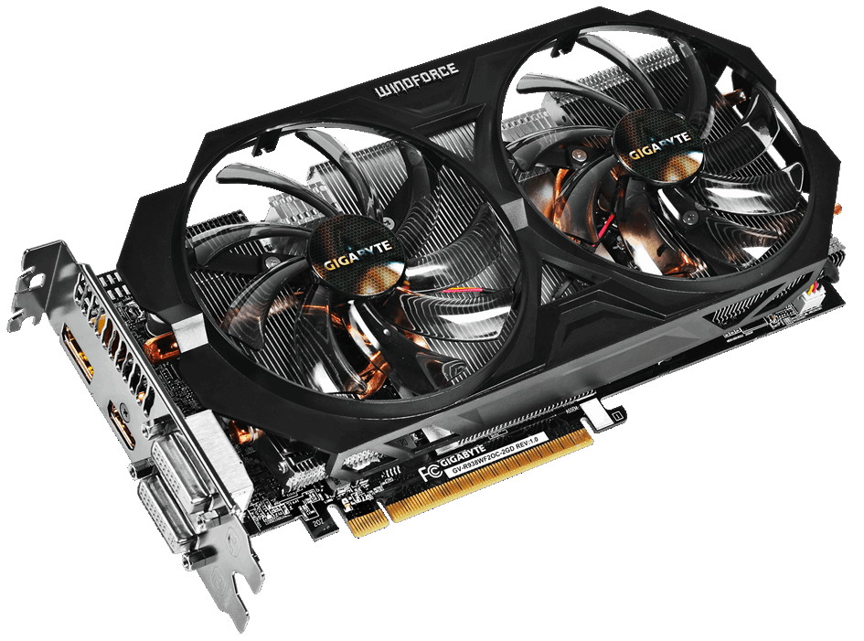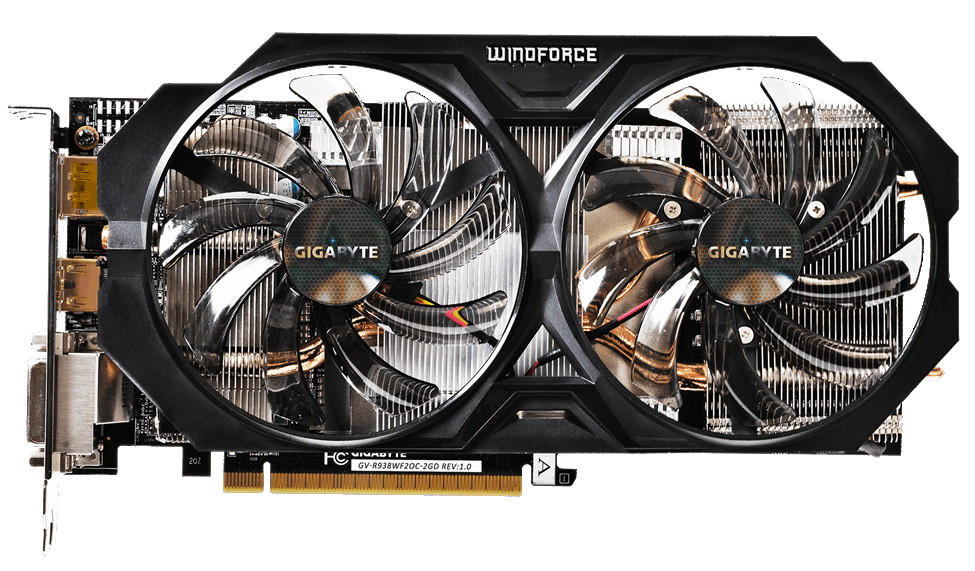 Gigabyte Radeon R9 380 WF2 OC 2 Go Gigabyte propose 2 modèles de R9 380, la WindForce 2 (WF2) en 2 Go et la Gaming en 4 Go. Nous nous sommes penchés sur la première qui est commercialisée en 2 variantes : classique (970 MHz) et OC (980 MHz). Par ailleurs il existe pour ces 2 variantes des versions 1.0 et 1.1. La carte que nous avons testée est la version 1.0 OC qui est commercialisée à environ 200€. La finition de cette carte est on ne peut plus basique avec une coque en plastique tout sauf rigide (mais Gigabyte a eu la bonne idée d'éviter le look brillant qui renforce le côté cheap), et un radiateur à la construction étrange avec 3 groupes d'ailettes principaux et 4 petits groupes de plus dont la densité est très faible. Les ailettes sont orientées verticalement, ce qui est en général un peu plus efficace et évite d'envoyer de l'air chaud vers les disques durs, et parcourues sur tout la longueur de la carte par 2 caloducs de 8mm. Si ce design nous a donné une première impression mitigée, en pratique il est par contre plutôt efficace comme nous allons le voir ! Au niveau de la connectique, cette R9 380 WF2 propose 2 sorties DVI, une sortie HDMI et une sortie DisplayPort. Deux connecteurs d'alimentation 6 broches sont nécessaires et 5 phases sont dédiées au GPU.