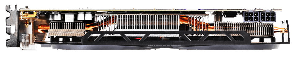 VTX3D Radeon R9 380 2 Go ![]() VTX3D propose un seul modèle de R9 380, cadencé aux fréquences de référence (970/1375 MHz) et simplement dérivé en variantes 2 Go et ou 4 Go. Nous nous sommes penchés sur la version 2 Go qui s'est retrouvée à prix cassé chez certains revendeurs (170€) mais semble actuellement indisponible. Pour sa R9 380, VTX3D a décidé d'investir dans un design "tout métal", autant pour la coque que pour la plaque arrière (qui ne participe pas au refroidissement), la seule carte de ce comparatif à en être pourvue. Plutôt compacte (21.5cm dont 0.7mm liés à la coque qui dépasse du PCB), la carte est donc rigide et bien protégée. Le ventirad en lui-même n'est par contre pas des plus costauds avec un radiateur de taille moyenne par rapport à ce type de GPU, même s'il est épaulé par 2 caloducs de 8mm et un troisième de 6mm.