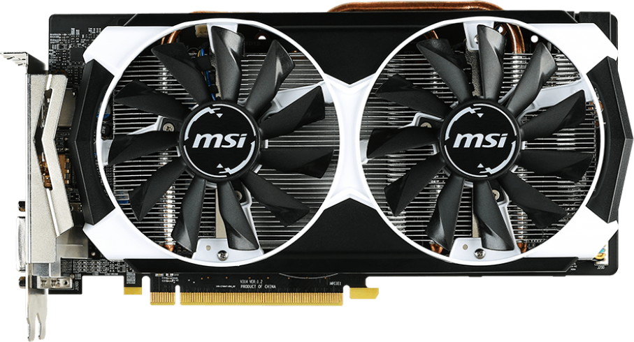 MSI Radeon R9 380 Armor 2x 2 Go MSI propose 2 modèles de R9 380, l'Armor 2x (980 MHz) et la Gaming (1000 MHz), qui existent chacun en versions 2 Go et 4 Go. Nous nous sommes penchés sur l'Armor 2x 2 Go qui est commercialisée à environ 200€. La coque en plastique noir et blanc brillant indique d'emblée que nous sommes face à une variante bon marché est l'ensemble manque un peu de rigidité. Le ventirad est constitué d'un large radiateur dont les ailettes sont orientées horizontalement, ce qui implique qu'une partie de l'air chaud sera renvoyée vers les disques durs. 3 caloducs de 6mm déportent une partie de la chaleur vers les extrémités du radiateur. Au niveau de la connectique, cette R9 380 Armor 2x propose 2 sorties DVI, une sortie HDMI et une sortie DisplayPort. Deux connecteurs d'alimentation 6 broches sont nécessaires et 6 phases sont dédiées au GPU sur un PCB relativement imposant avec une hauteur supérieure de 1.5cm à la normale.
