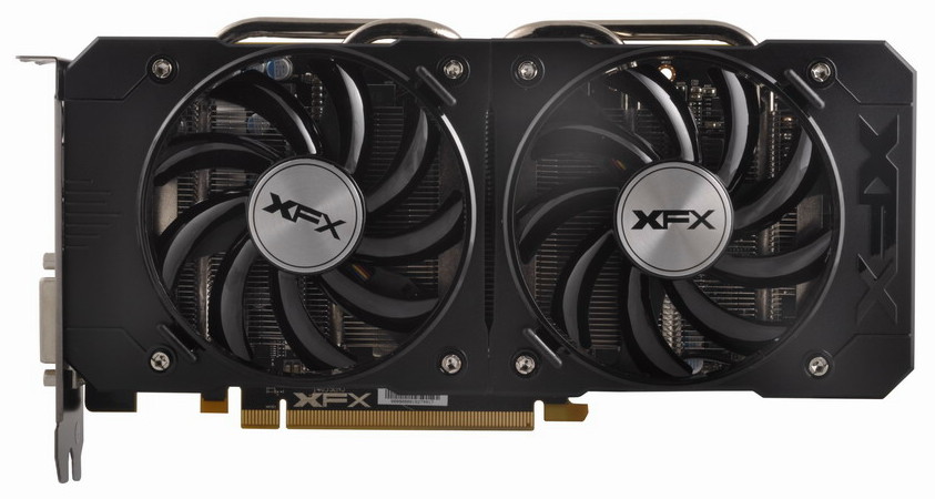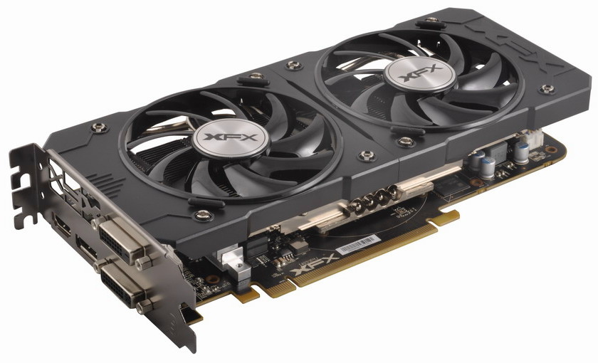 XFX Radeon R9 380 DD XXX OC 2 Go XFX propose un seul modèle de R9 380, la Double Dissipation XXX, dérivée en 4 variantes : 2 ou 4 Go et OC (990 MHz) ou Black Edition OC (1030 MHz). Nous nous sommes penchés sur la DD XXX OC 2 Go qui est commercialisée à environ 190€. Malgré un tarif plutôt agressif, XFX a fait un petit effort sur le design du PCB, qui a été arrondi, et de la coque. Même si elle manque un peu de rigidité et allonge la carte d'un bon centimètre sans autre raison que d'y placer un logo, elle est plus travaillée que chez la concurrence et des clips permettent d'extraire les ventilateur pour les nettoyer. Le ventirad est constitué d'un radiateur de taille moyenne dont les ailettes sont orientées horizontalement, ce qui implique qu'une partie de l'air chaud sera renvoyée vers les disques durs. 4 caloducs de 6mm déportent la chaleur vers les extrémités du radiateur. Au niveau de la connectique, cette R9 380 DD XXX propose 2 sorties DVI, une sortie HDMI et une sortie DisplayPort. Deux connecteurs d'alimentation 6 broches sont nécessaires et 5 phases sont dédiées au GPU. Un petit bouton présent sur le dessus du PCB permet de désactiver l'UEFI.