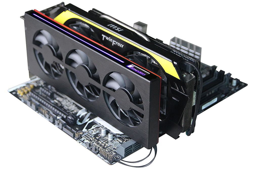 En pratique même si Jonsbo annonce une baisse de température de l'ordre de 5°C on peut se poser des questions sur l'intérêt d'un tel système d'autant que le flux d'air créé ne sera pas forcément cohérent par rapport au système de refroidissement actif de la carte graphique. Le VF-1 est alimenté par une prise SATA duquel le 12V est utilisé pour les ventilateurs qui tournent à 1500 rpm et ne sont pas réglables. On notera également, pour ceux qui ne seraient toujours pas convaincu (sic), que le tout dispose d'un éclairage RGB sur la tranche.