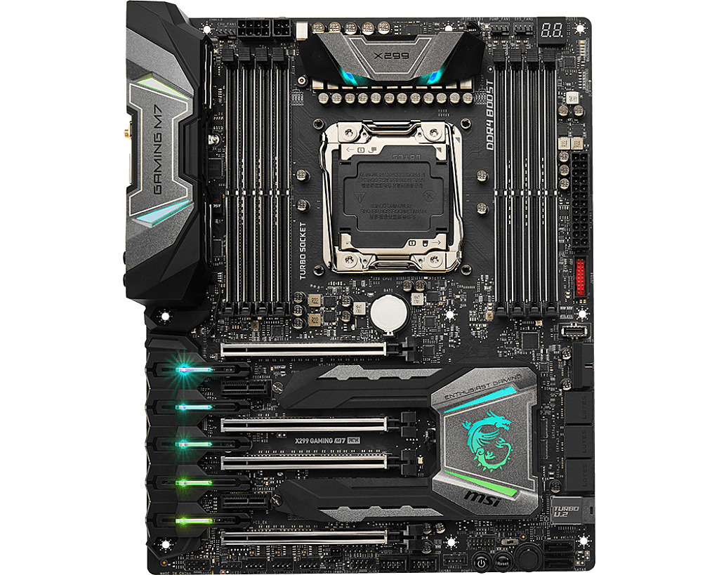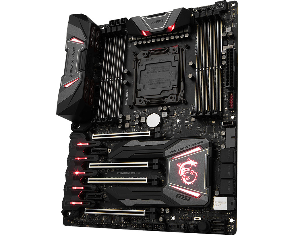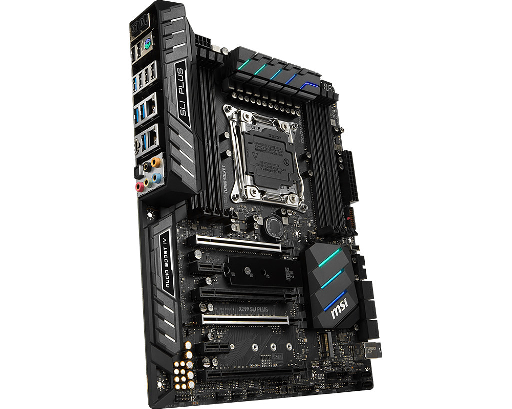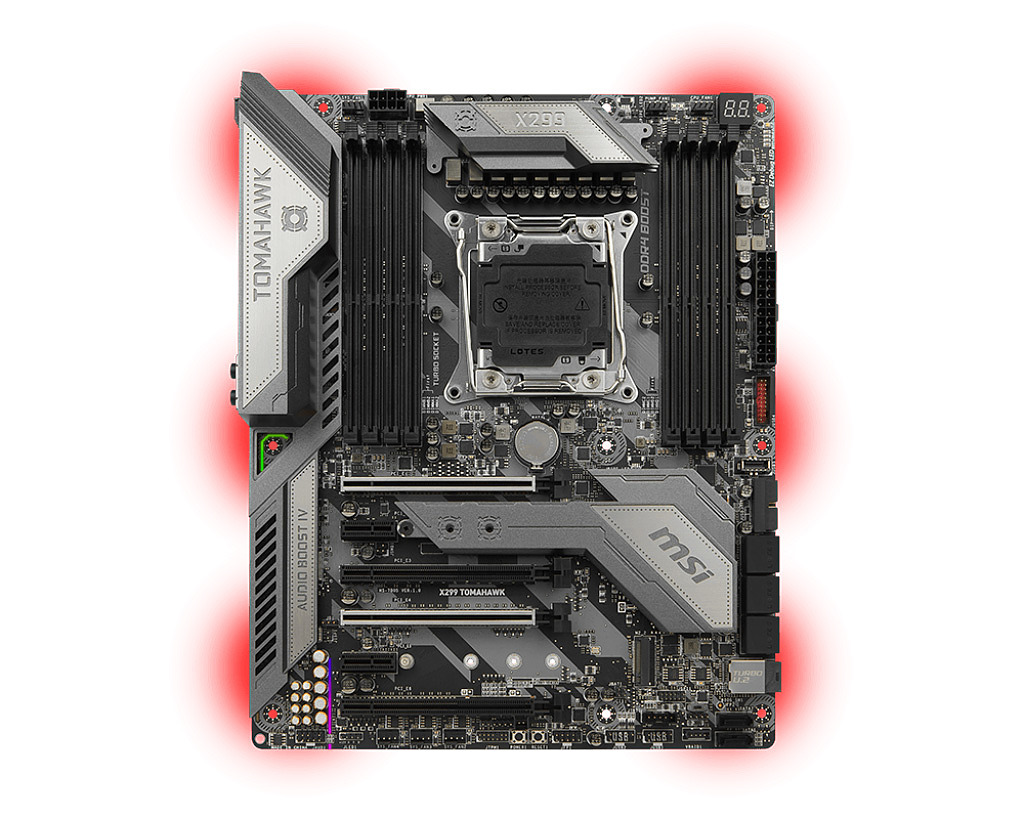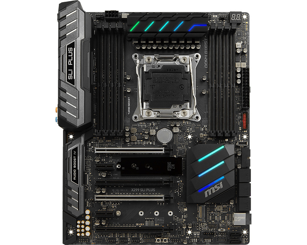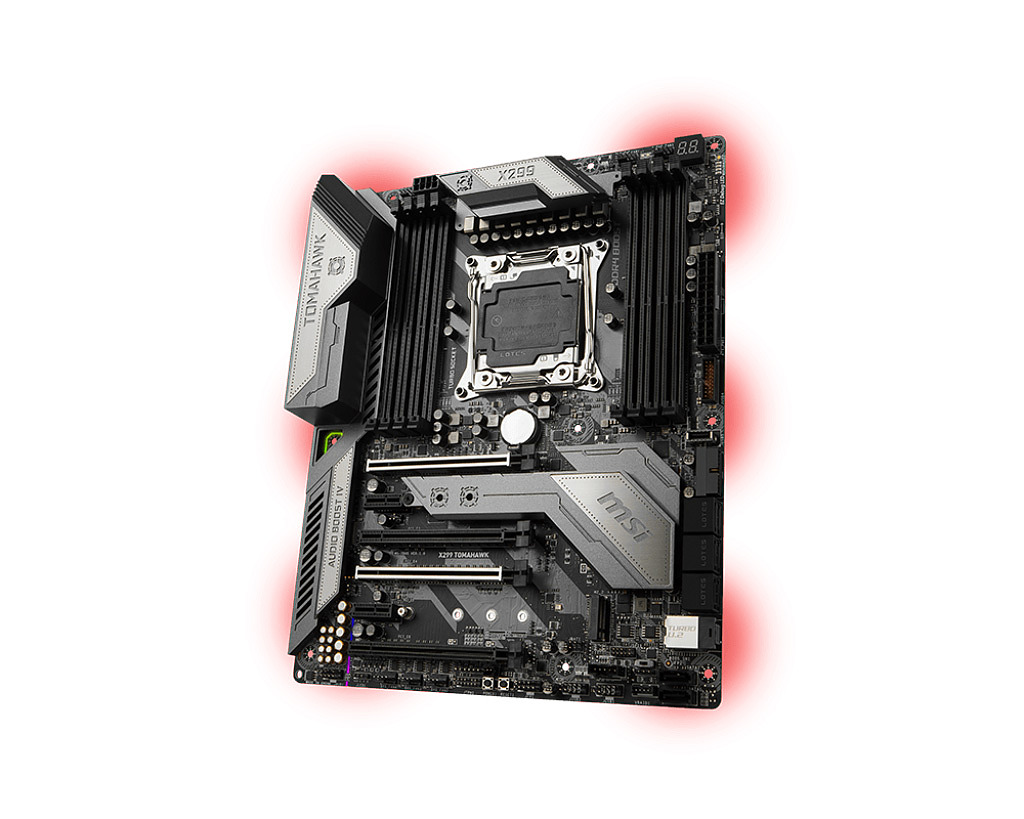 Les X299 Tomahawk et X299 SLI Plus partagent également un même PCB, avec cette-fois 8 phases d'alimentation et 3 ports PCIe x16 reliés au CPU. Ils fonctionnent en x16/x16/x8 et x16/x8/x4 avec des processeurs gérant 44 et 28 lignes PCIe, avec 16 lignes on aura le choix entre x8/x8/x0 ou x8/x4/x4. S'ajoute à ses ports autre x16 relié en x4 et 2 ports x1, tous trois reliés au X299.