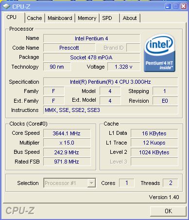 Overclocking processeur Intel Pentium 4 3.0E à 3 GHz @ 3.644 GHz