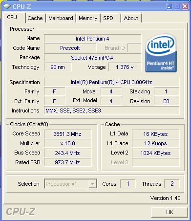 Overclocking processeur Intel Pentium 4 3.0E à 3 GHz @ 3.651 GHz