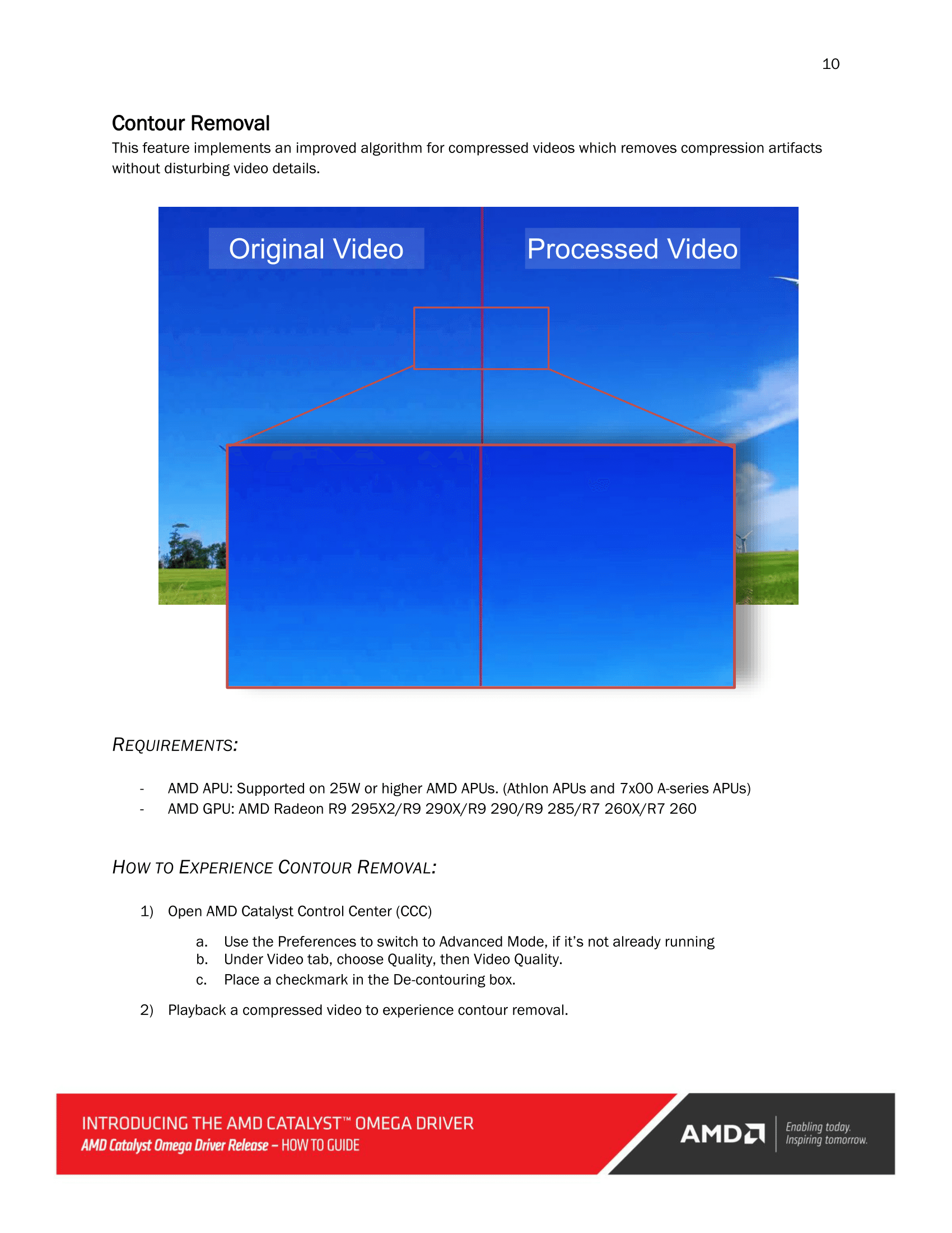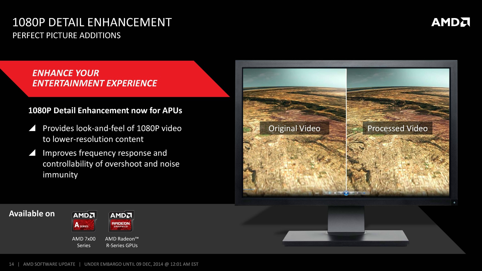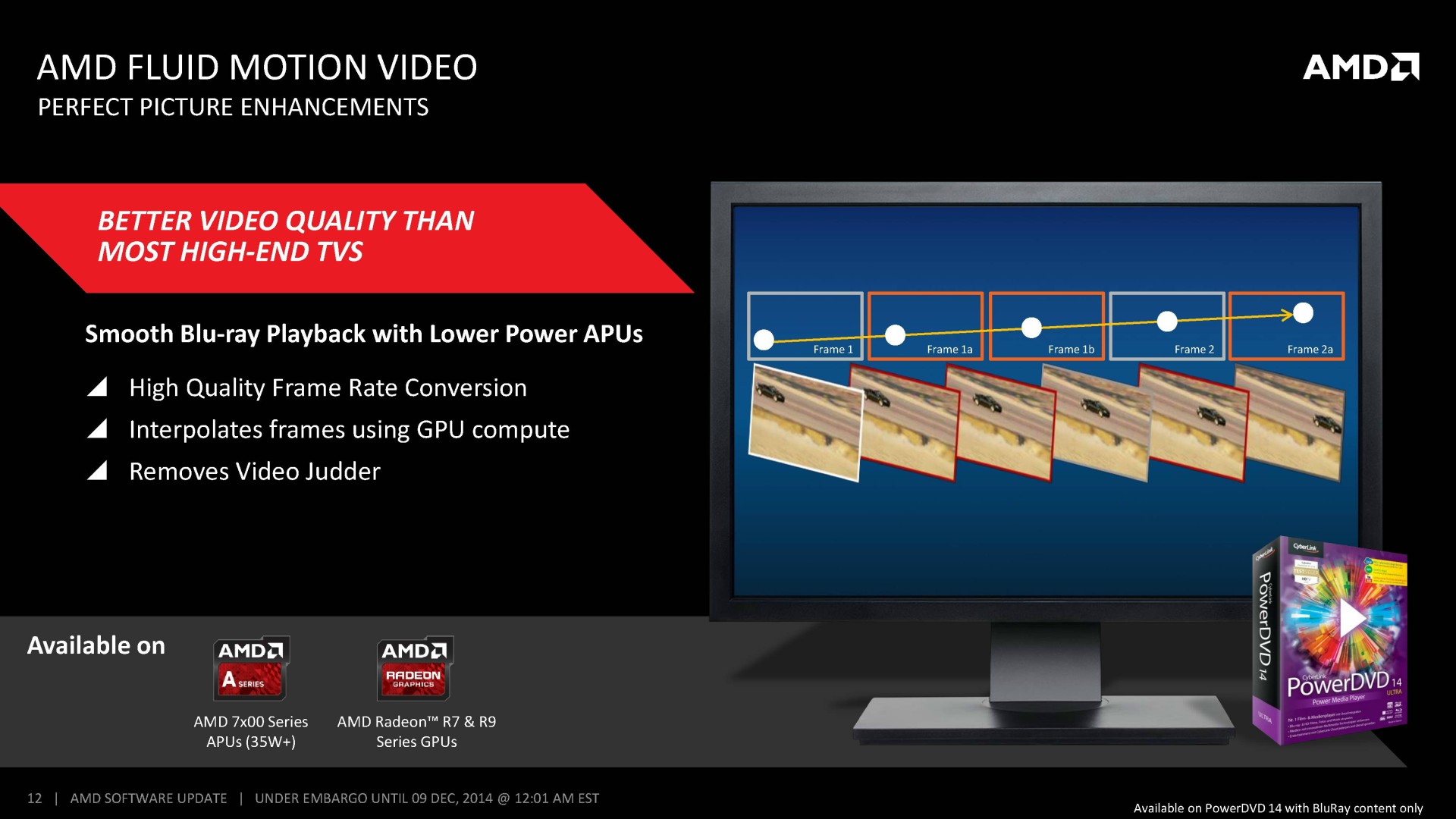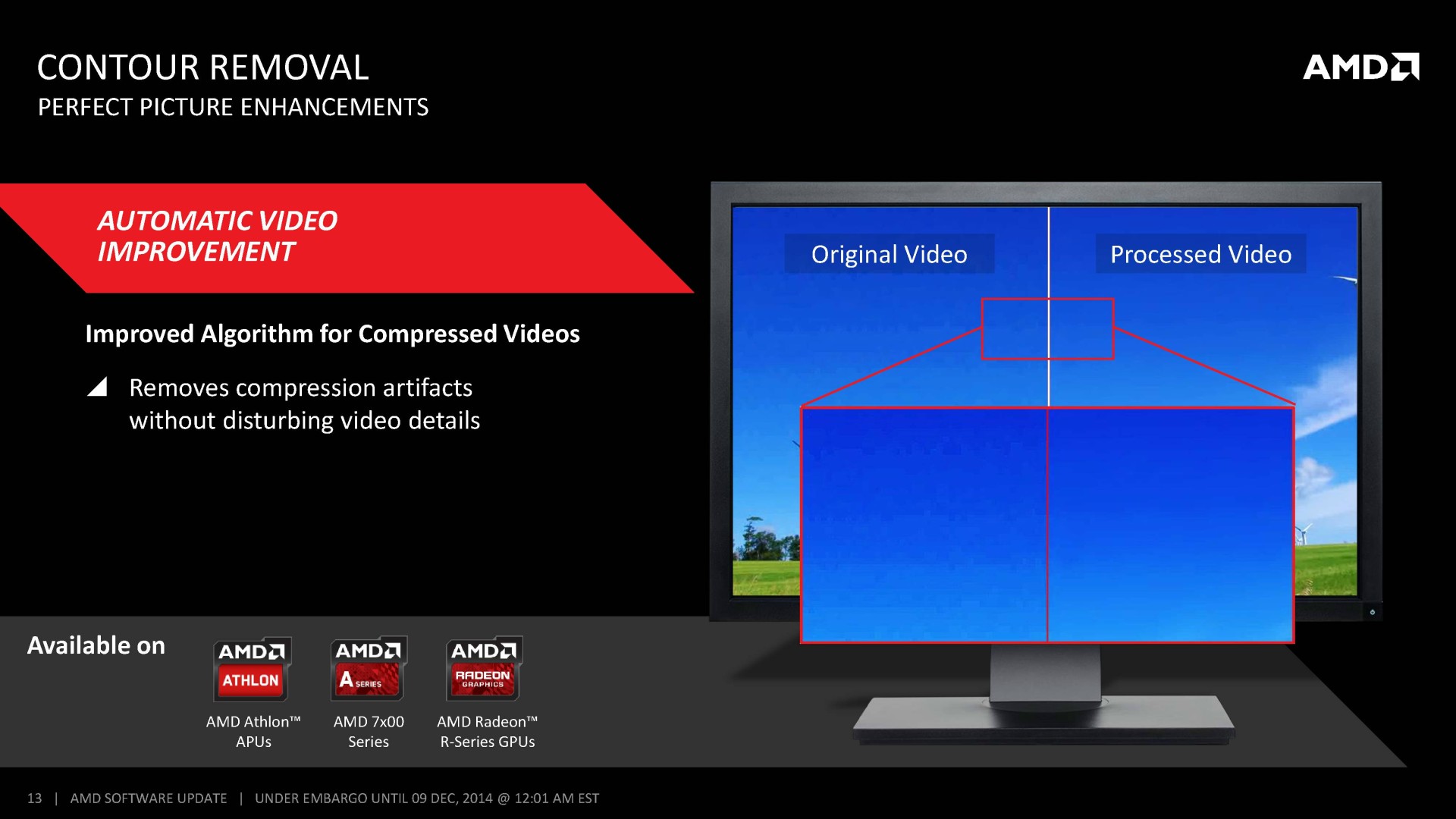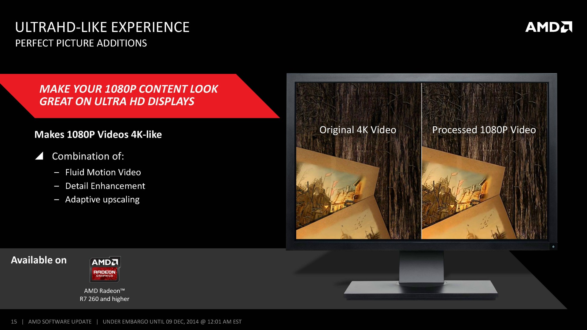 Ces options ne sont pas réellement nouvelles, mais elles ont été améliorées et sont maintenant supportées par plus de produits, notamment par les APU A-7000 avec quelques restrictions (il faut au minimum un modèle 25W pour le Contour Removal et 35W pour le Fluid Motion). Pour le reste elles sont supportées par les Radeon R9 295X2/290X/290/285/260X/260.