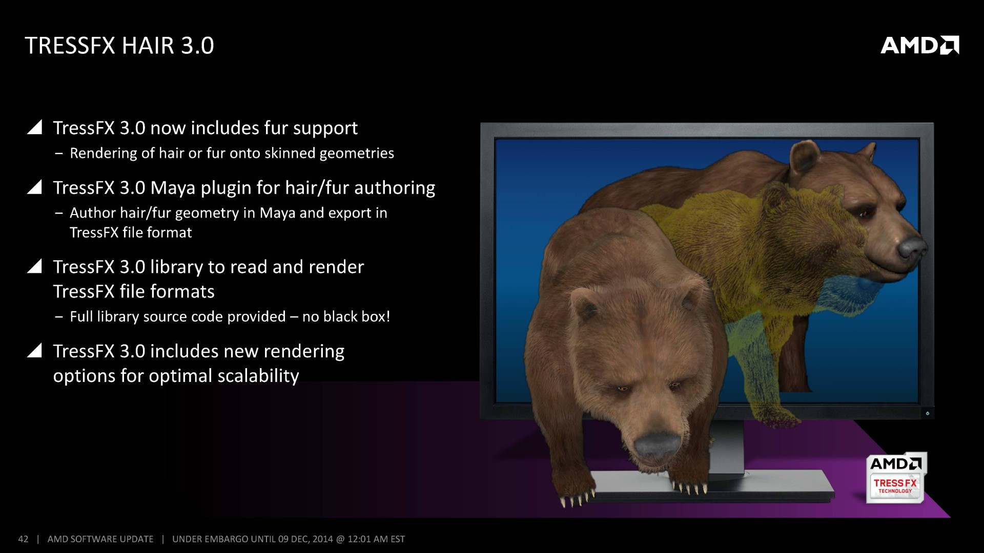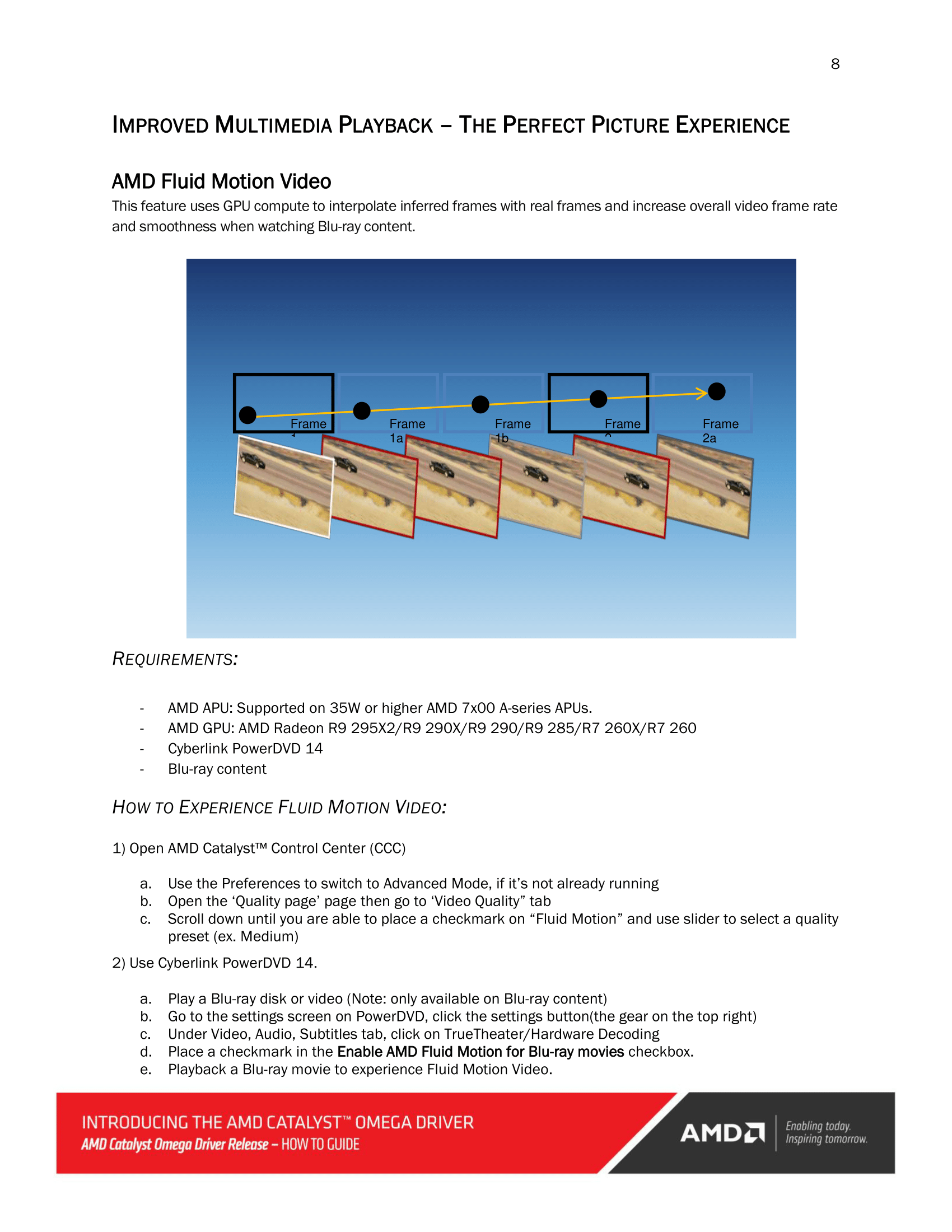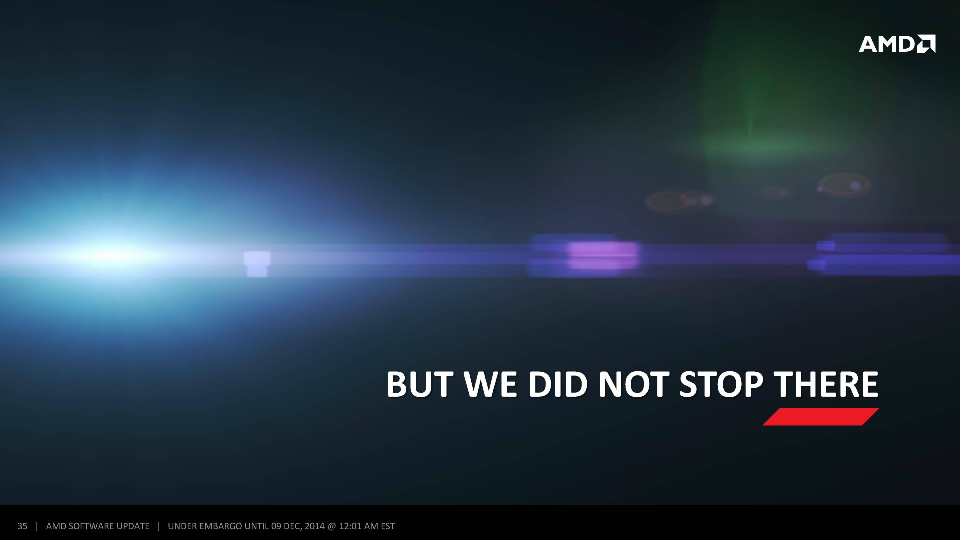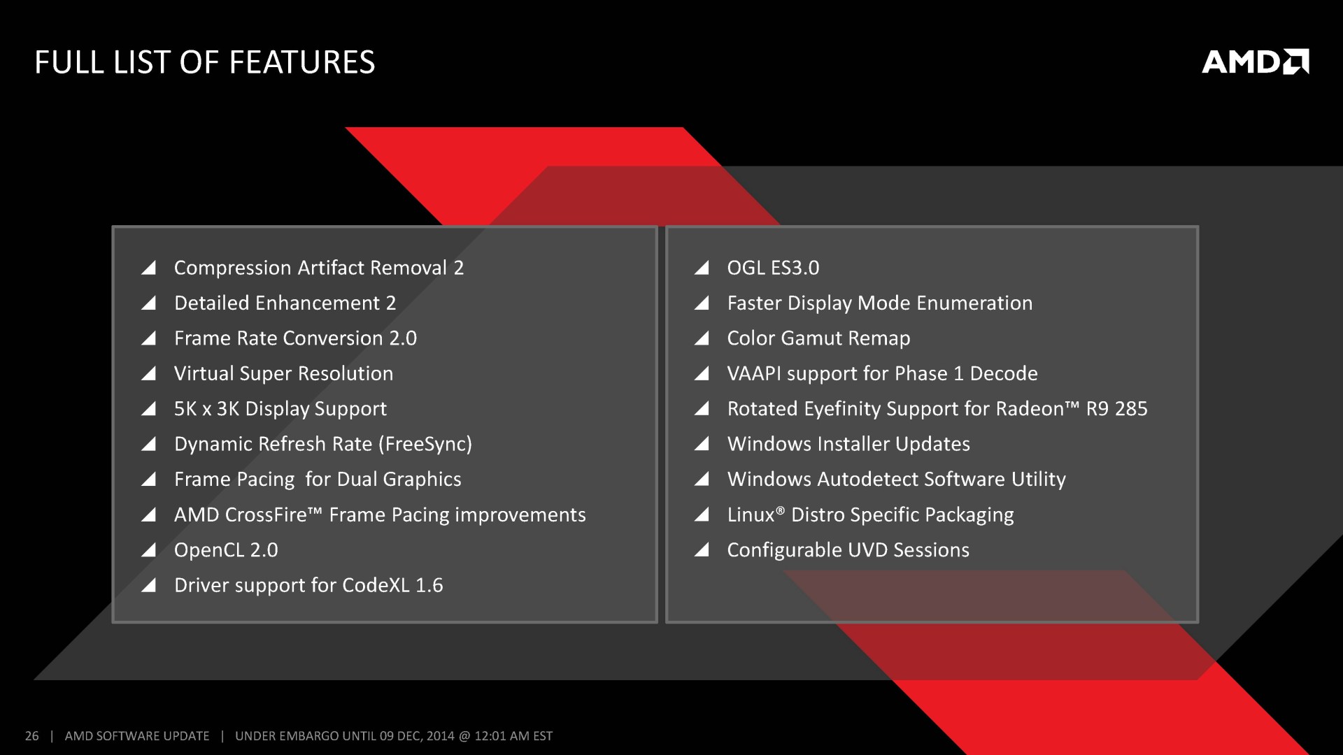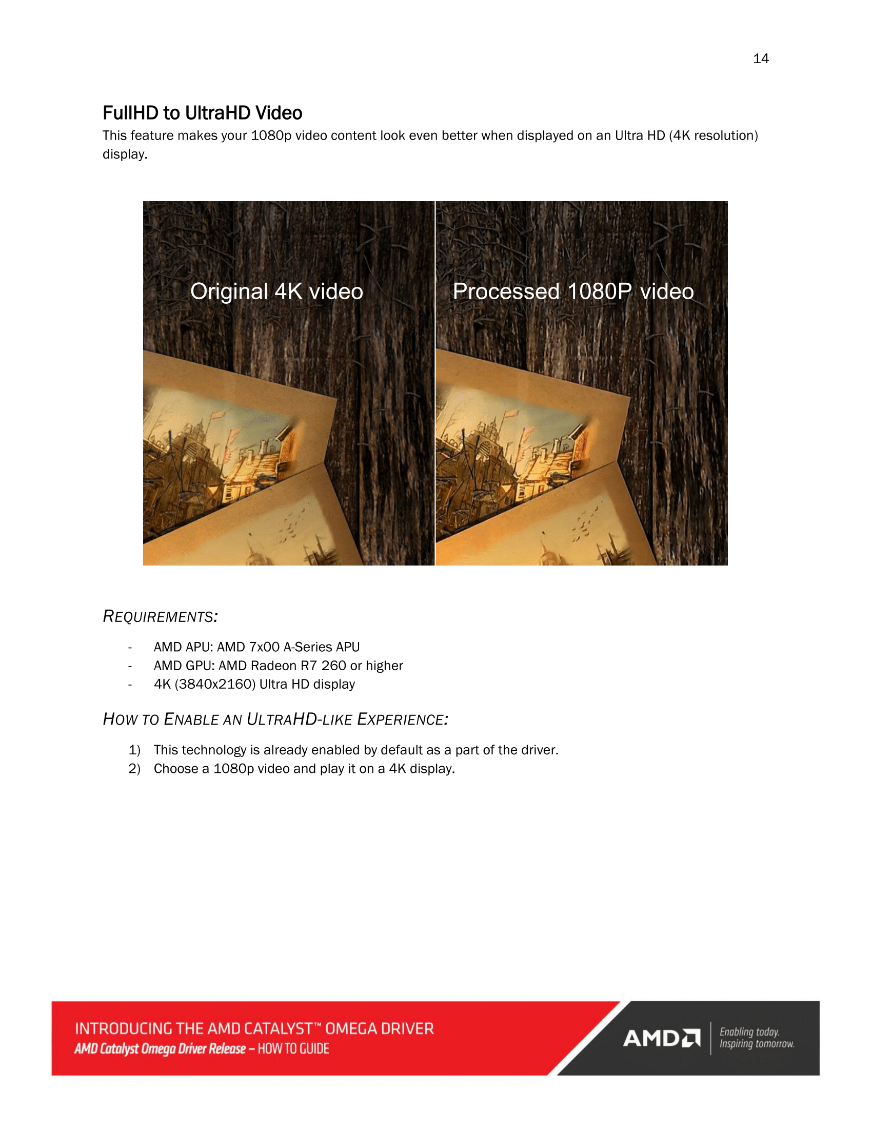 Ces options ne sont pas réellement nouvelles, mais elles ont été améliorées et sont maintenant supportées par plus de produits, notamment par les APU A-7000 avec quelques restrictions (il faut au minimum un modèle 25W pour le Contour Removal et 35W pour le Fluid Motion). Pour le reste elles sont supportées par les Radeon R9 295X2/290X/290/285/260X/260.