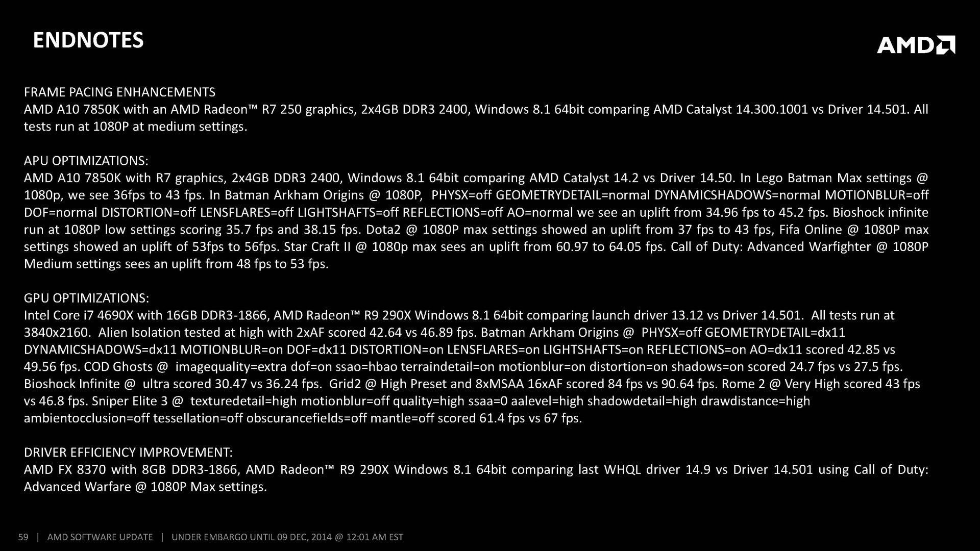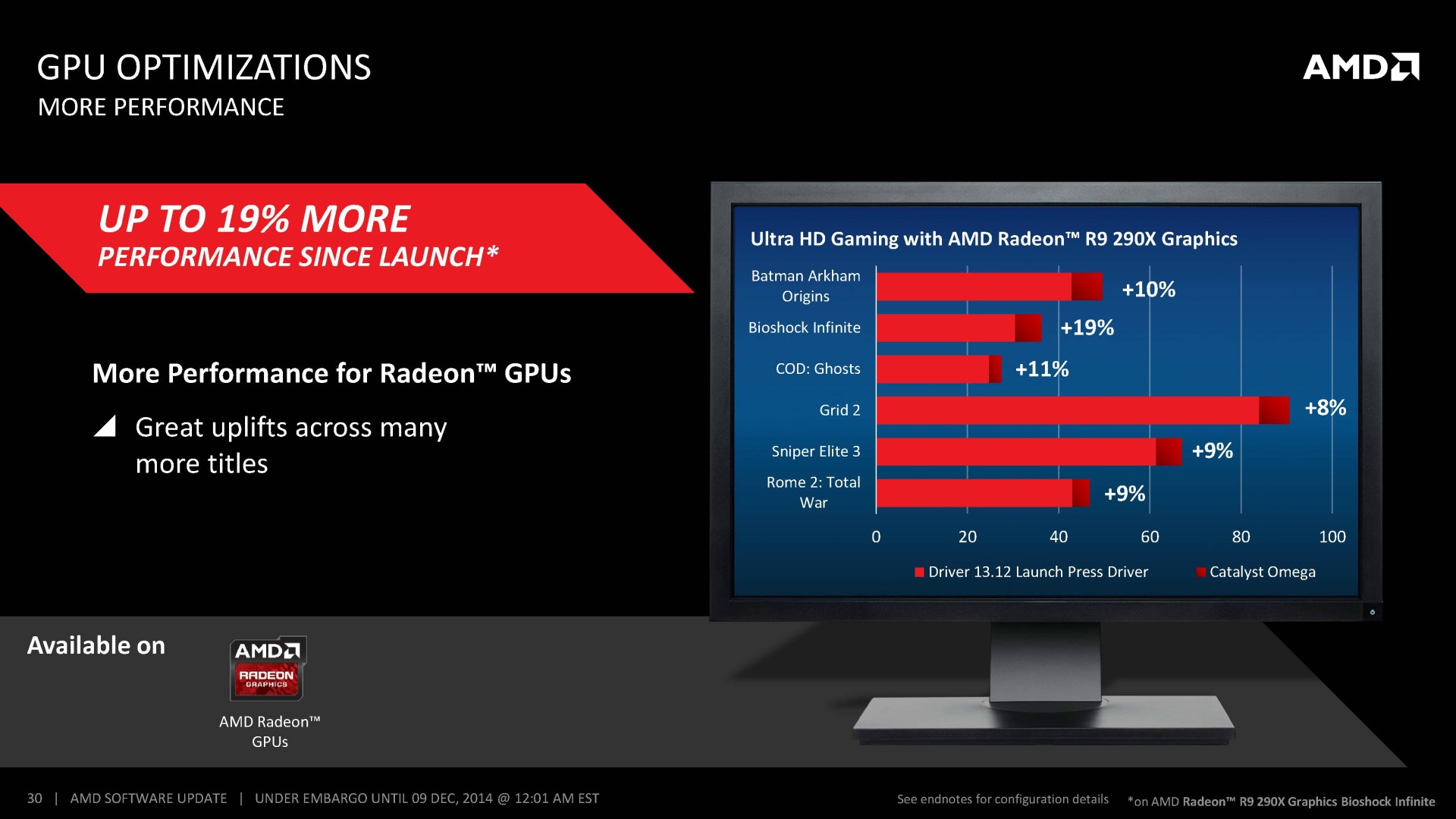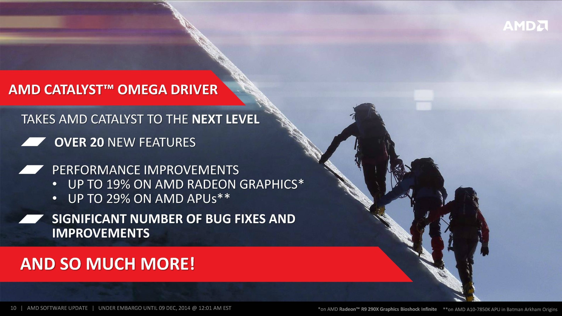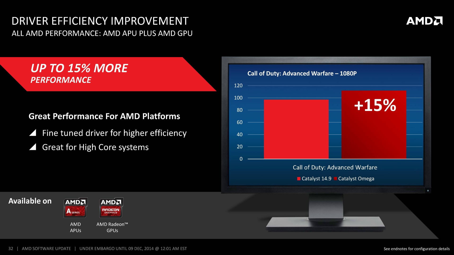 Enfin, AMD met en avant des gains de performances, mais pour la majorité de ceux-ci ils ne sont pas liés aux Catalyst Omega et sont en fait déjà disponibles dans les autres pilotes récents. Les gains mis en avant par AMD sont en fait ceux obtenus par rapport aux pilotes d'introduction des Radeon R9 290 (décembre 2013) et des APU A-7000 (février 2014).