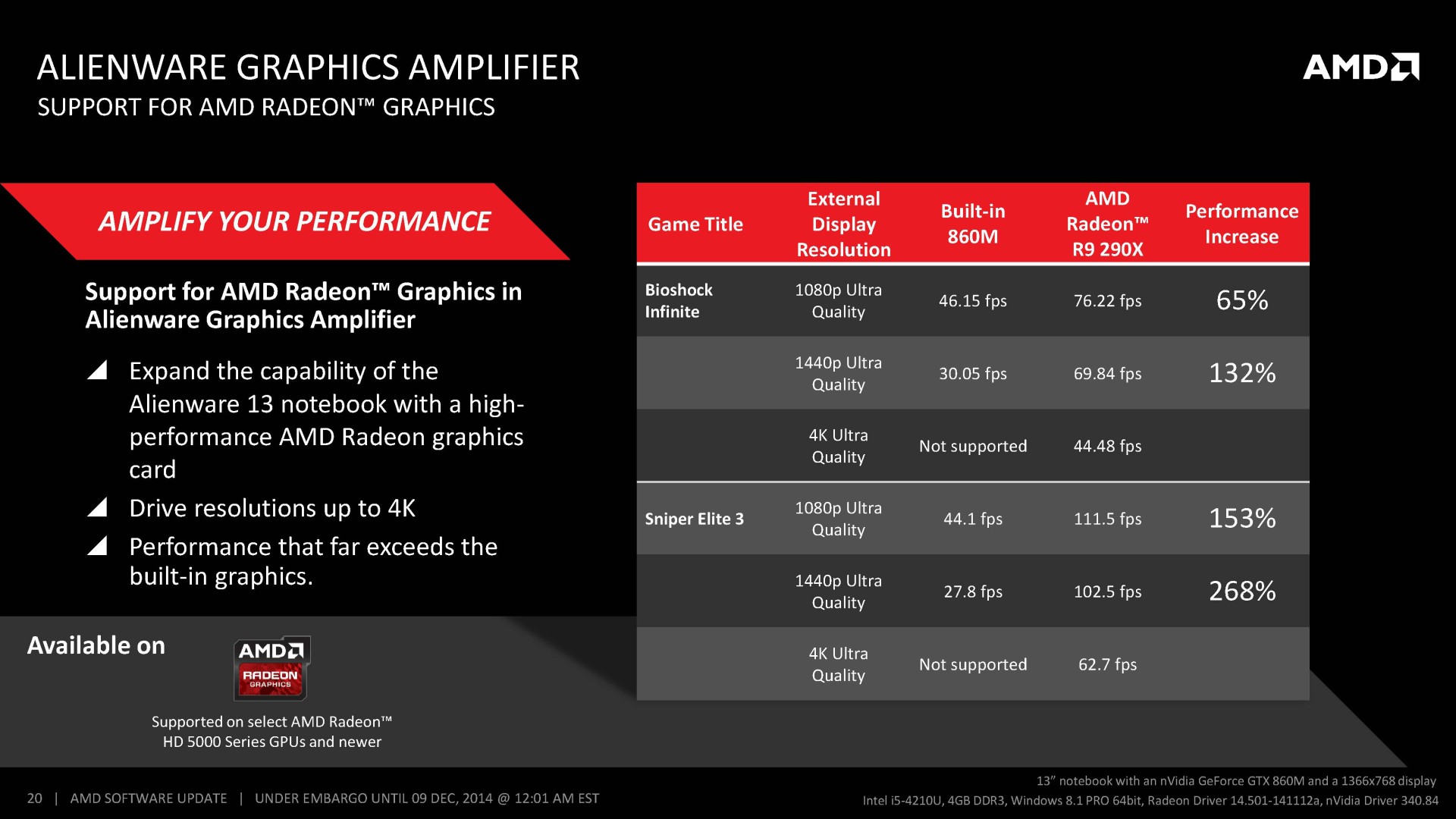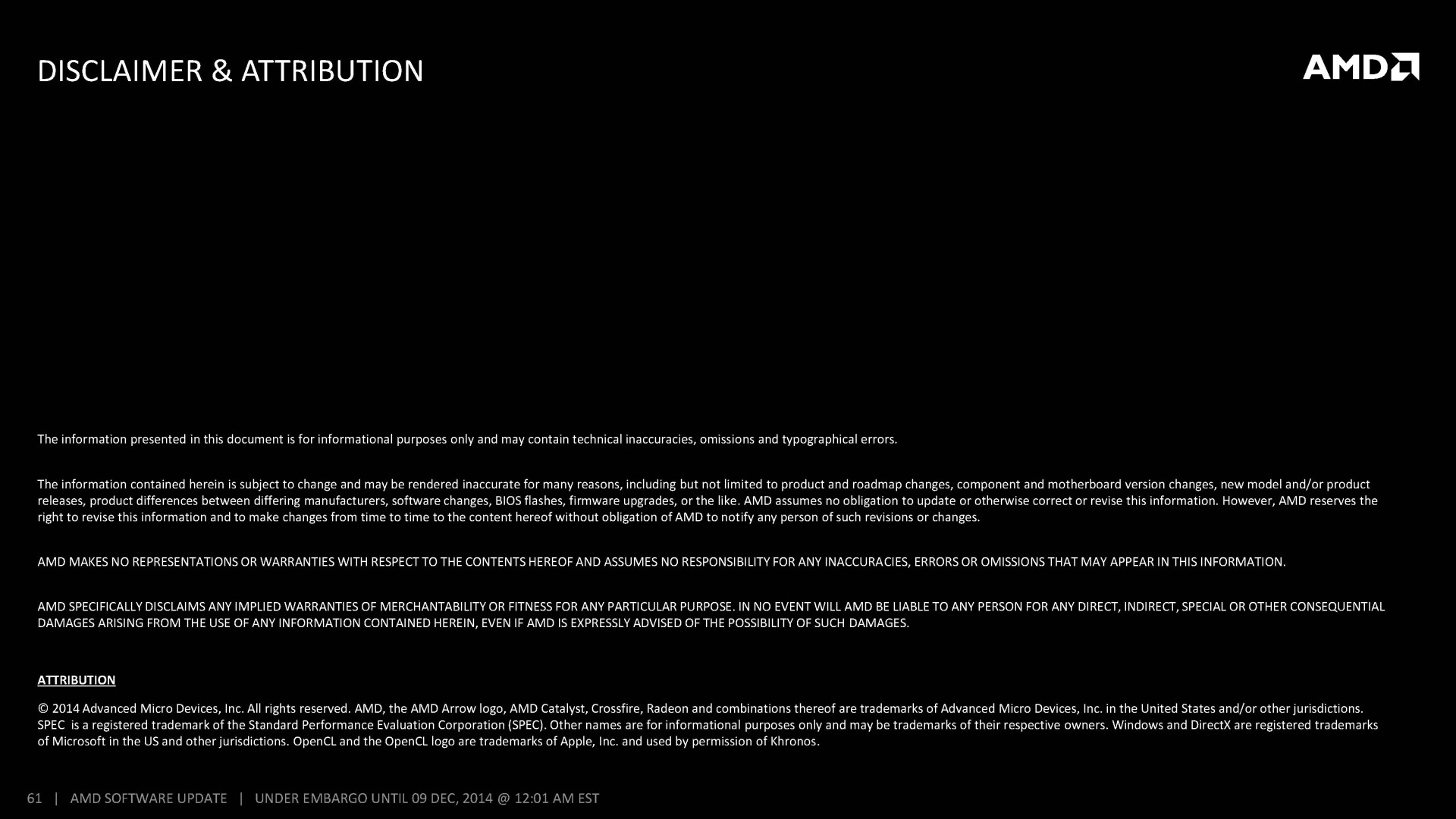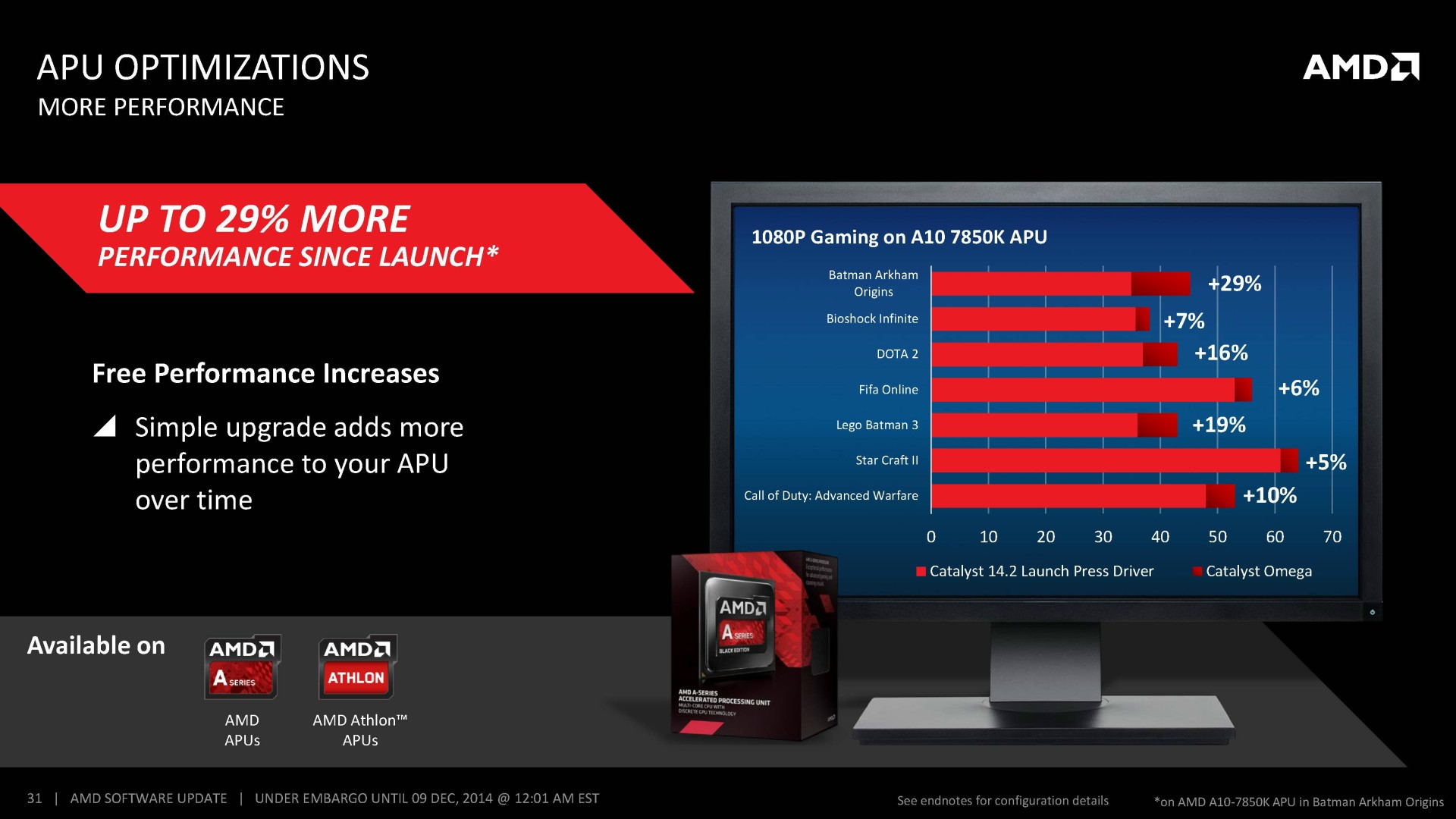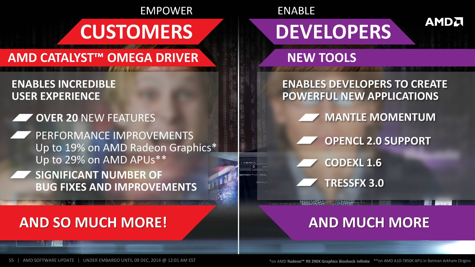 Enfin, AMD met en avant des gains de performances, mais pour la majorité de ceux-ci ils ne sont pas liés aux Catalyst Omega et sont en fait déjà disponibles dans les autres pilotes récents. Les gains mis en avant par AMD sont en fait ceux obtenus par rapport aux pilotes d'introduction des Radeon R9 290 (décembre 2013) et des APU A-7000 (février 2014).