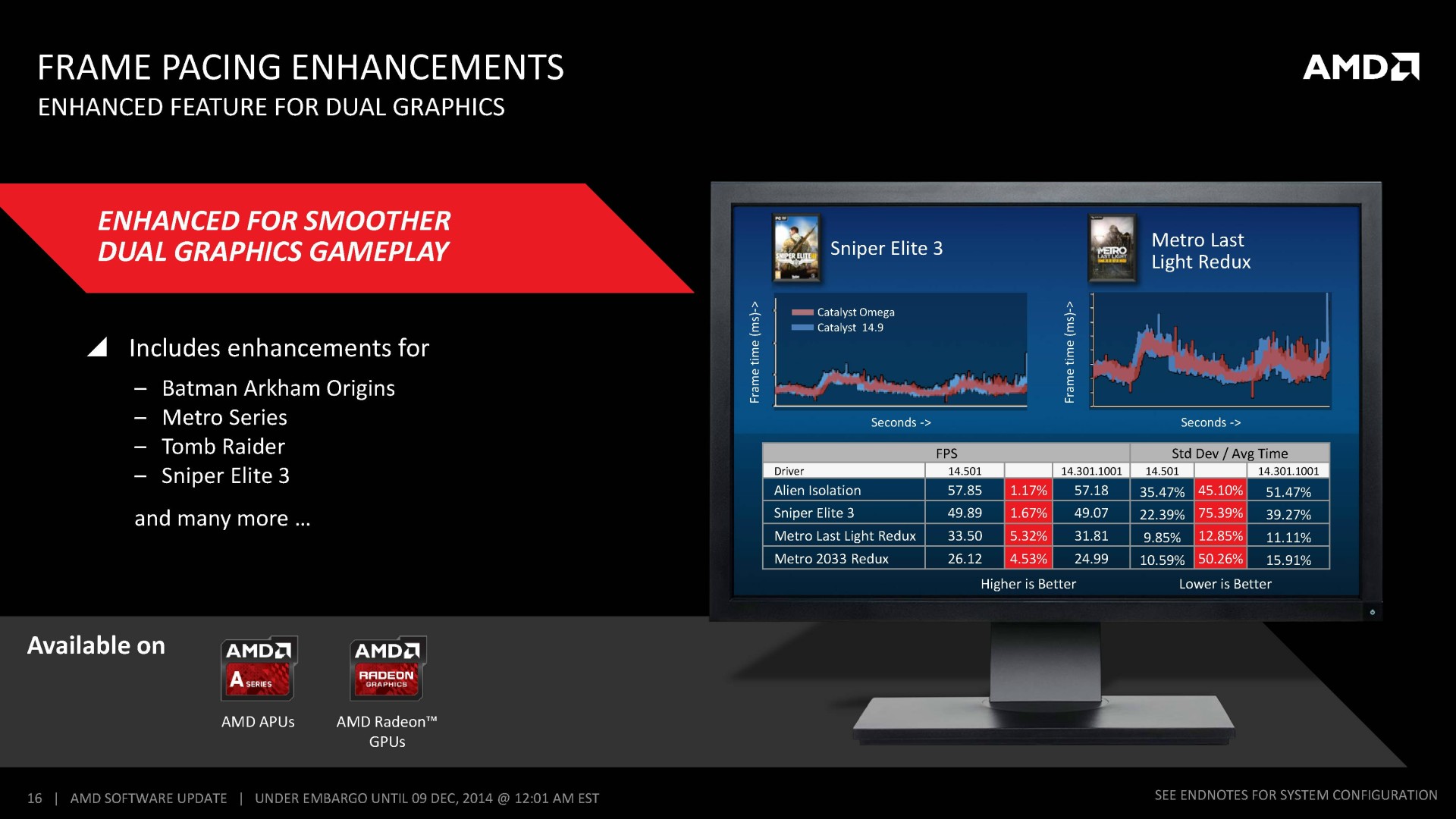 En attendant l'arrivée de FreeSync, AMD améliore quelque peu l'algorithme de Frame Pacing exploité avec CrossFire. Par ailleurs ce Frame Pacing est désormais fonctionnel dans le cas problématique jusqu'ici du Dual Graphics.