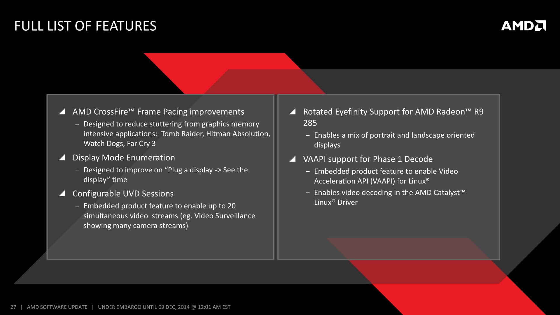 Les nouveautés des Catalyst Omega, 14.12, 14.501En attendant que tout cela porte ses fruits, les Catalyst Omega débarquent. Il s'agit en réalité des Catalyst 14.12, qui en notation plus complète correspondent à la branche 14.501 (les pilotes betas précédents étaient issus de la branche 14.301). AMD nous en a fourni une version RC et la version WHQL vient d'être rendue disponible :