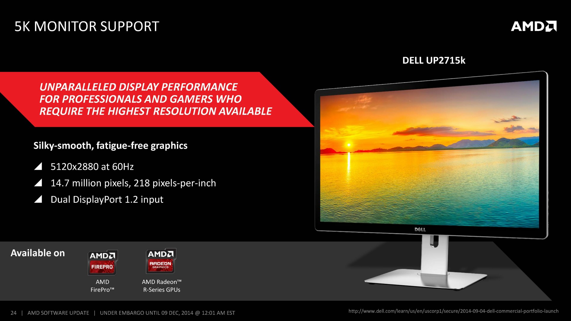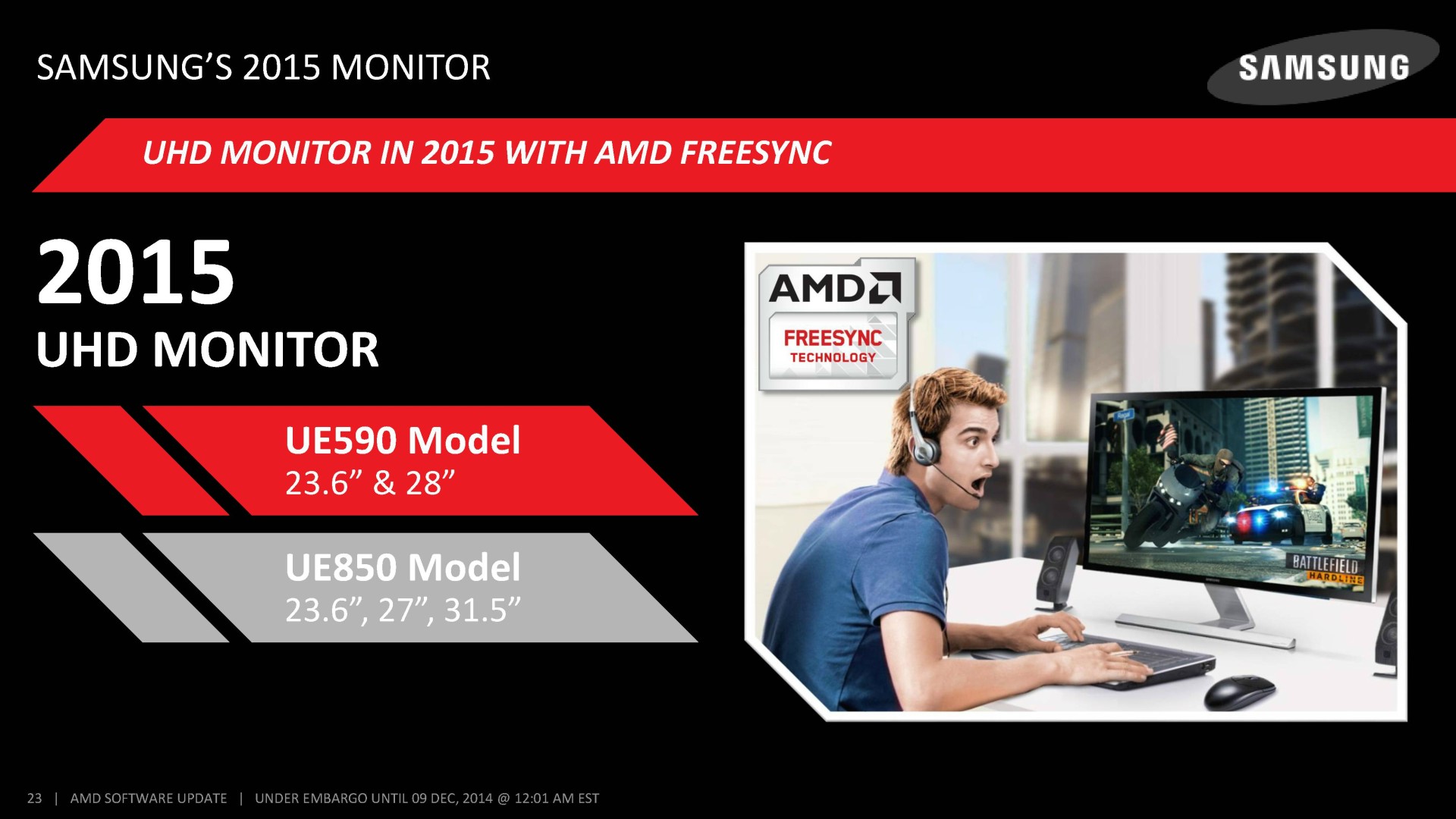 Au niveau de l'affichage, ces pilotes apportent le support des écrans 5K et surtout de FreeSync et du taux de rafraîchissement dynamique. Bien que ces écrans FreeSync ne soient pas encore disponibles sur le marché, ils ne devraient plus tarder et AMD précisent que les pilotes de cette branche sont actuellement exploités par les fabricants d'écrans pour valider le bon fonctionnement de FreeSync.