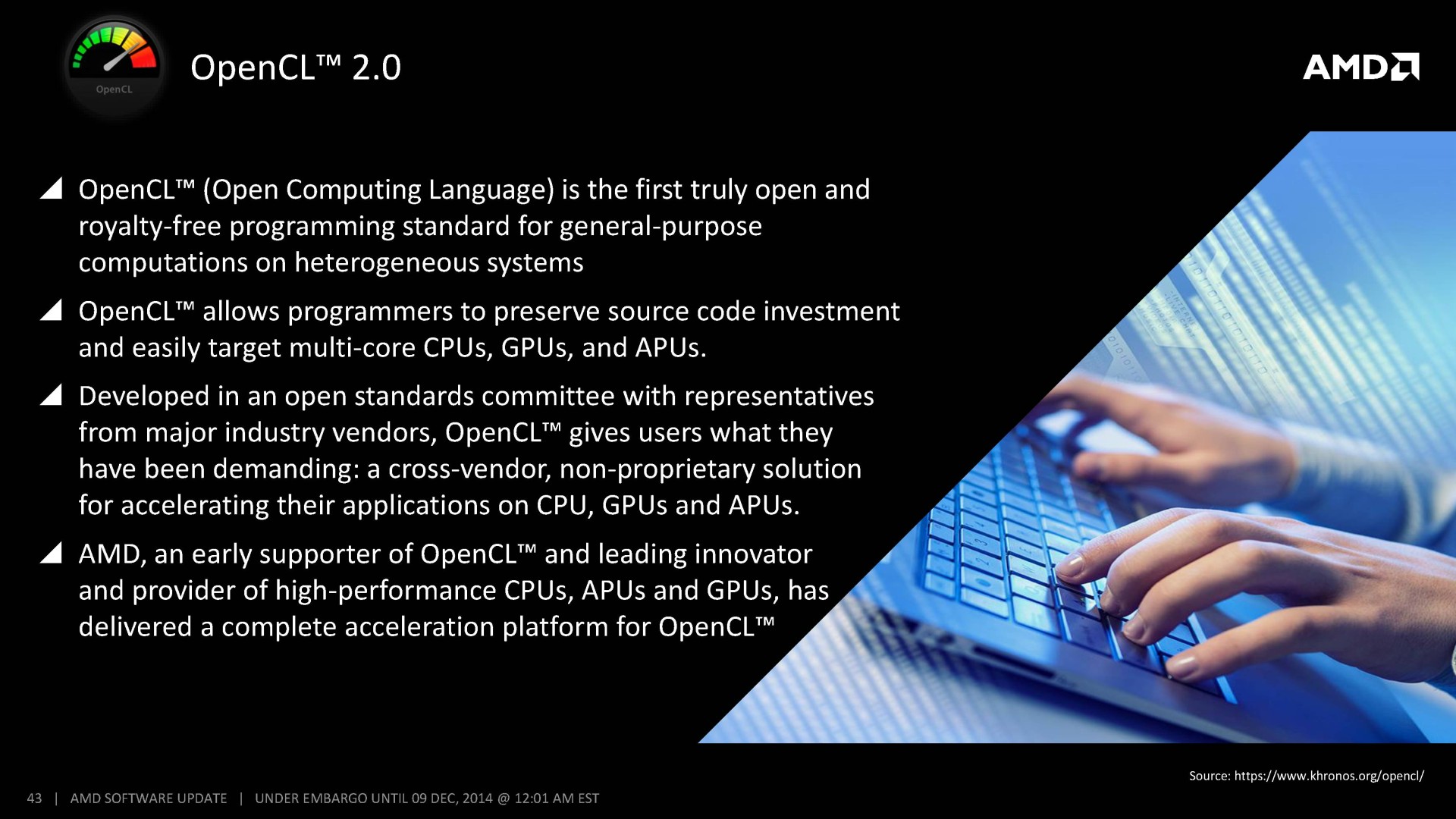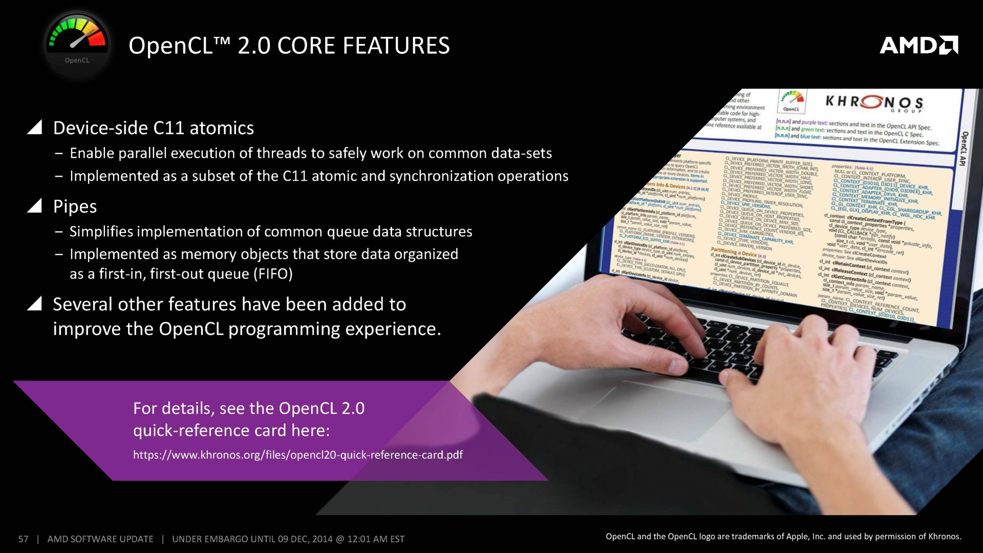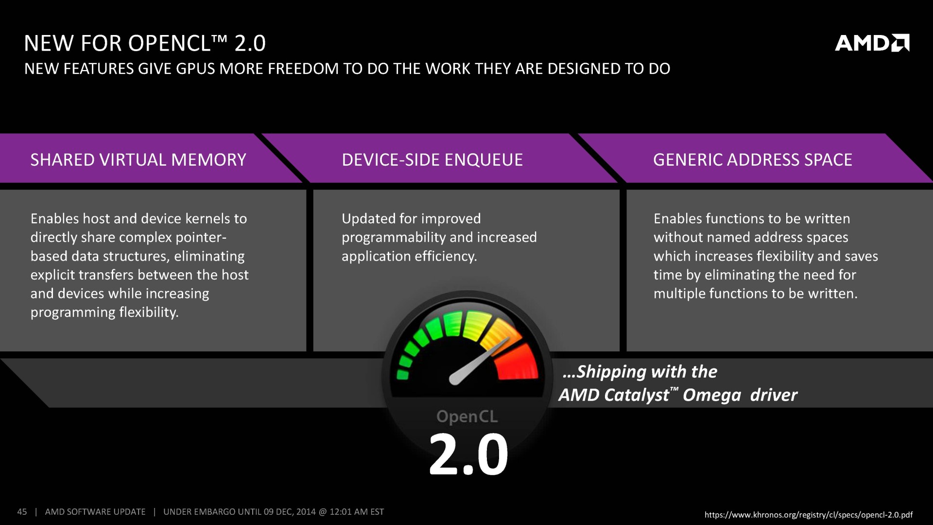 Les Catalyst Omega représentent l'occasion pour AMD d'intégrer dans la branche standard de ses pilotes le support d'OpenCL 2.0 qui était jusqu'ici proposé à travers un pilote beta spécifique. Il en va de même pour OpenGL ES 3.0, principalement exploité dans le monde mobile, mais qui pourrait également trouver sa place sur PC.